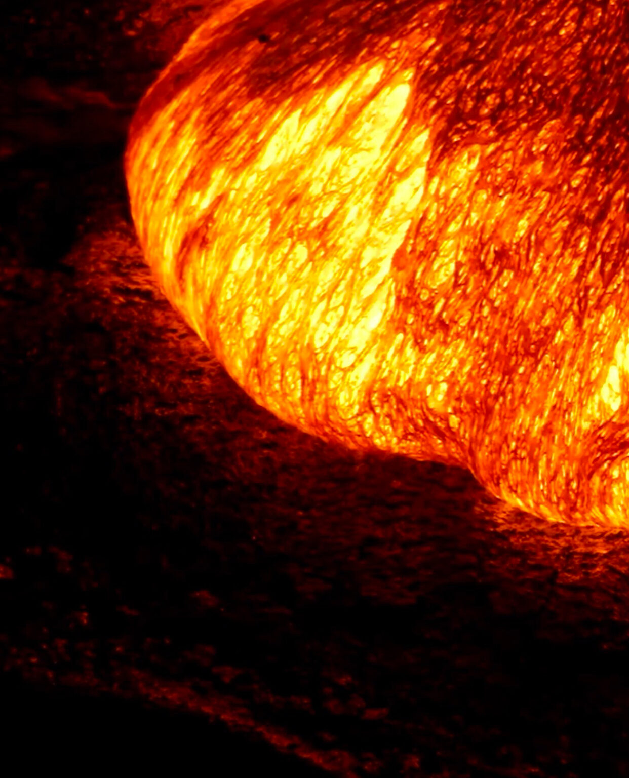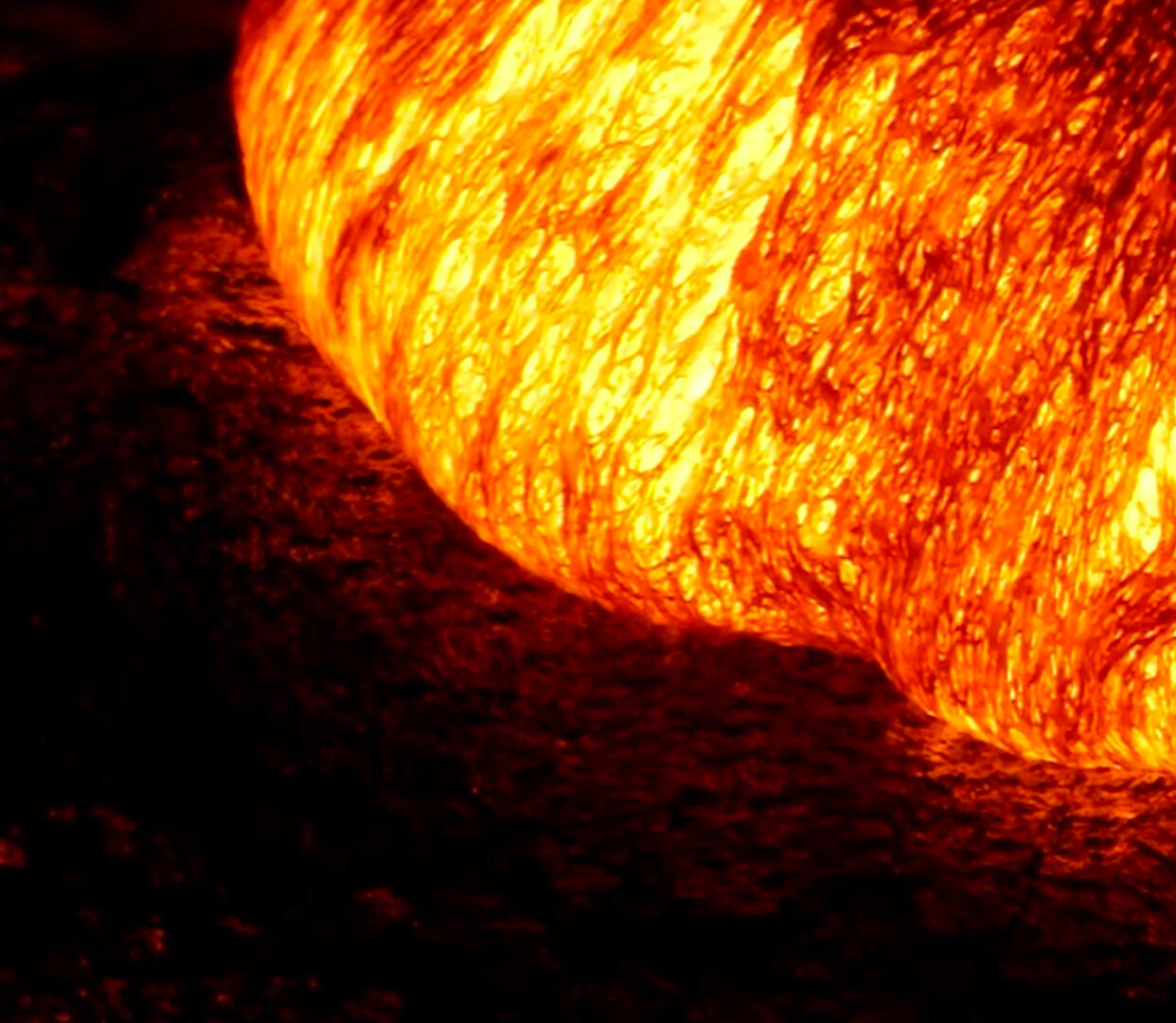 A bright orange sun fills the frame, partially obscured by darkness. The surface shows intense texture with bright ridges and shadowed valleys.