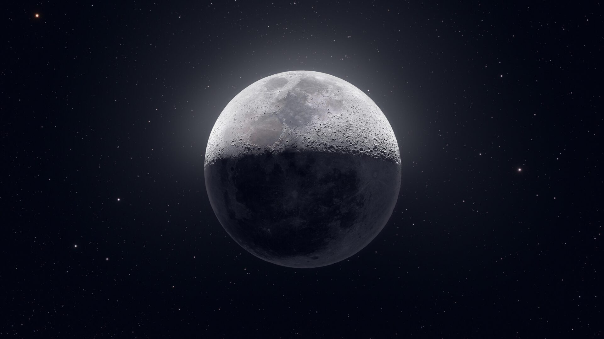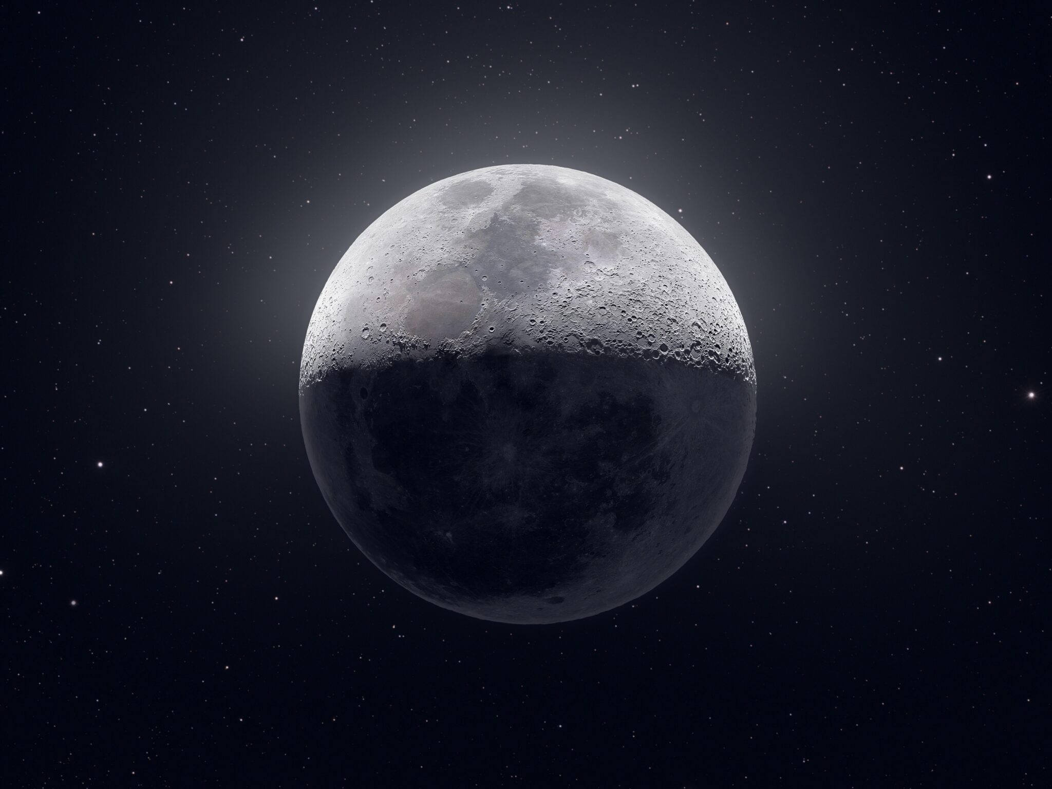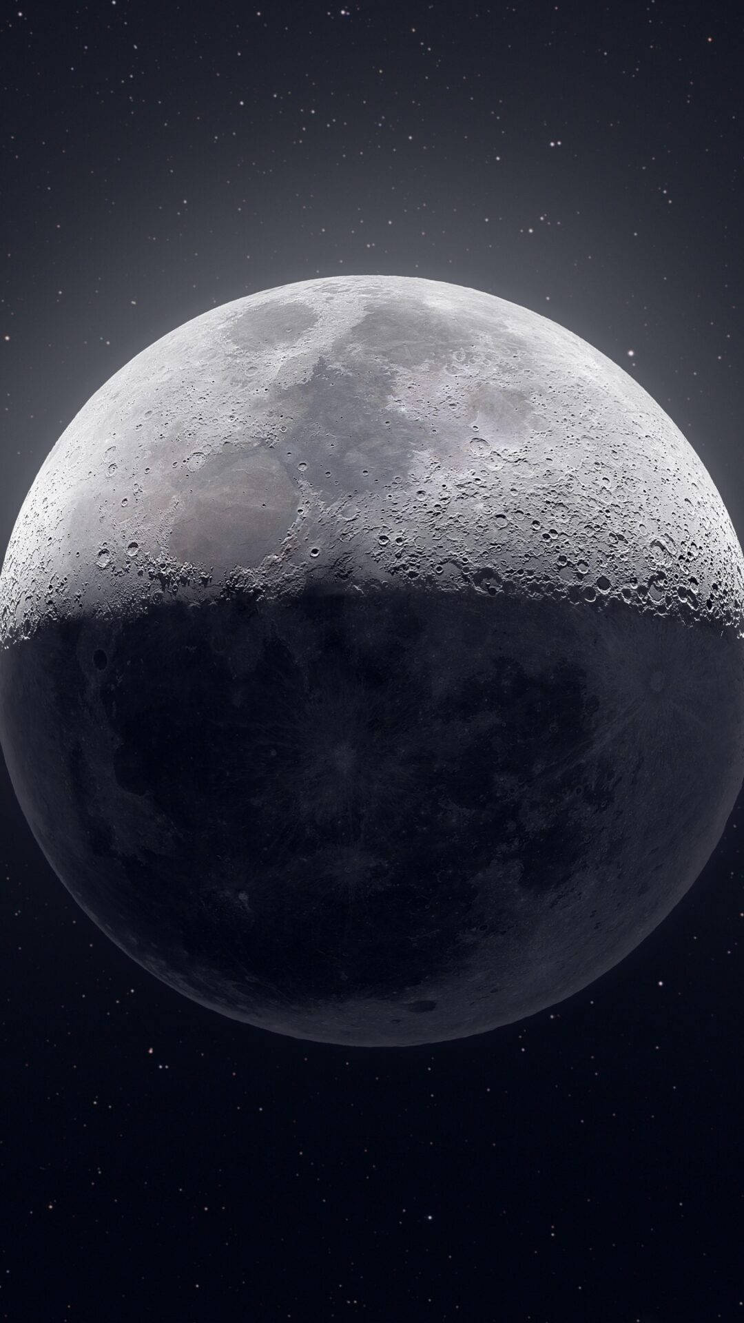 Crisp lunar surface details pop against the deep black starfield, with the moon's gray and white craters beautifully illuminated while its shadowed portion fades into darkness. Works wonderfully for 4K desktop backgrounds when you want that peaceful space aesthetic.