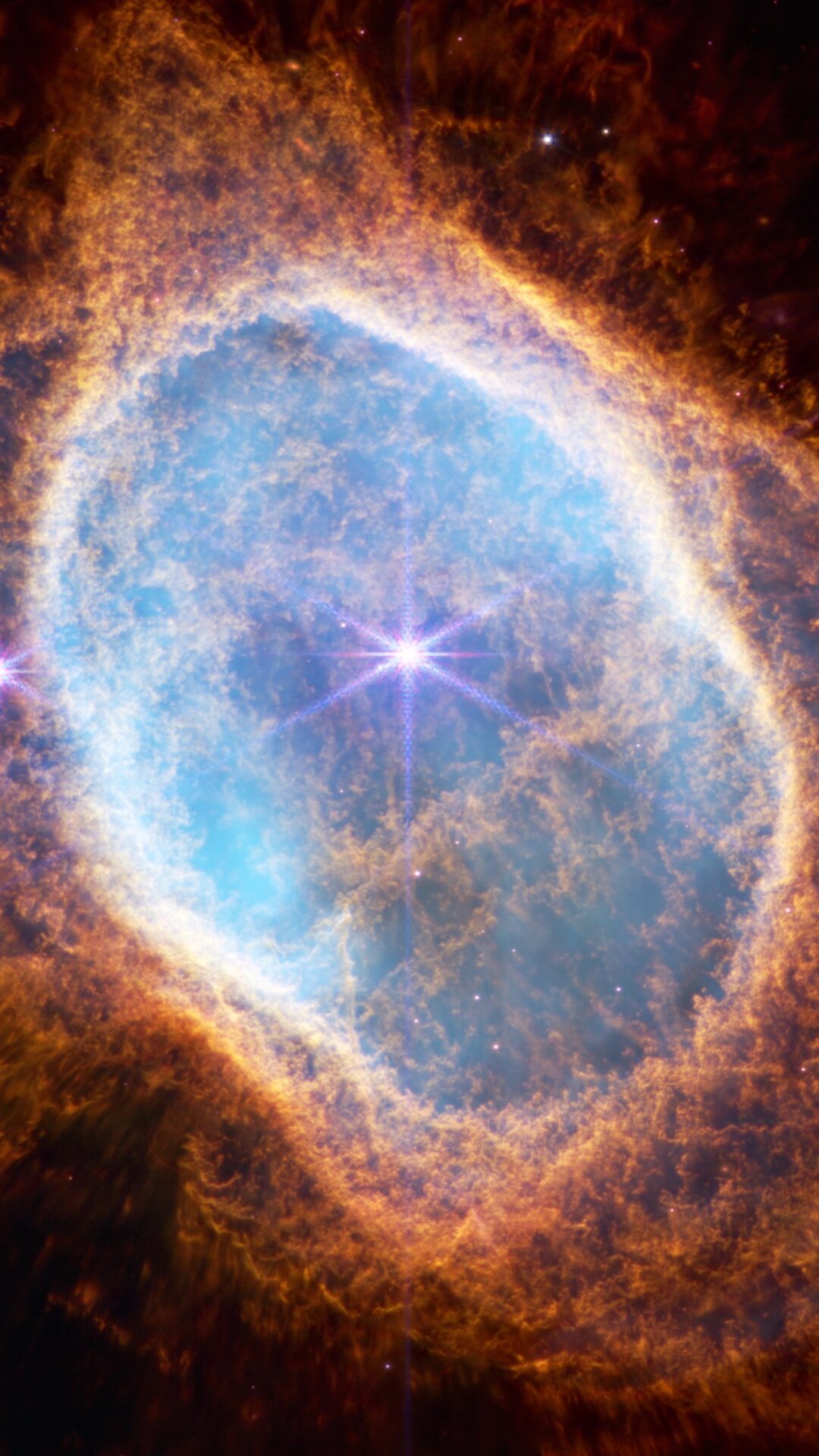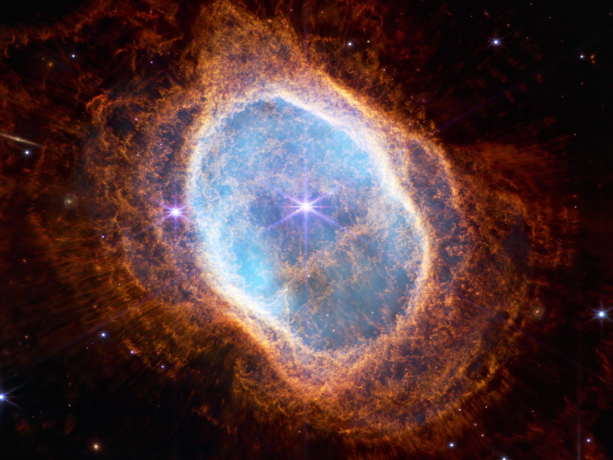 Webb's infrared vision reveals the Southern Ring Nebula's intricate layers, with brilliant blue and white gases at the center surrounded by …