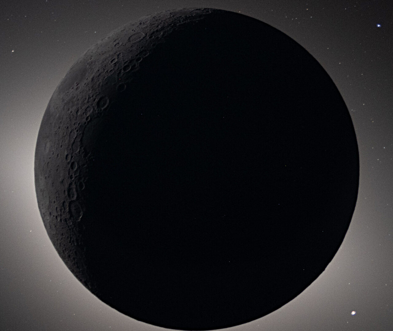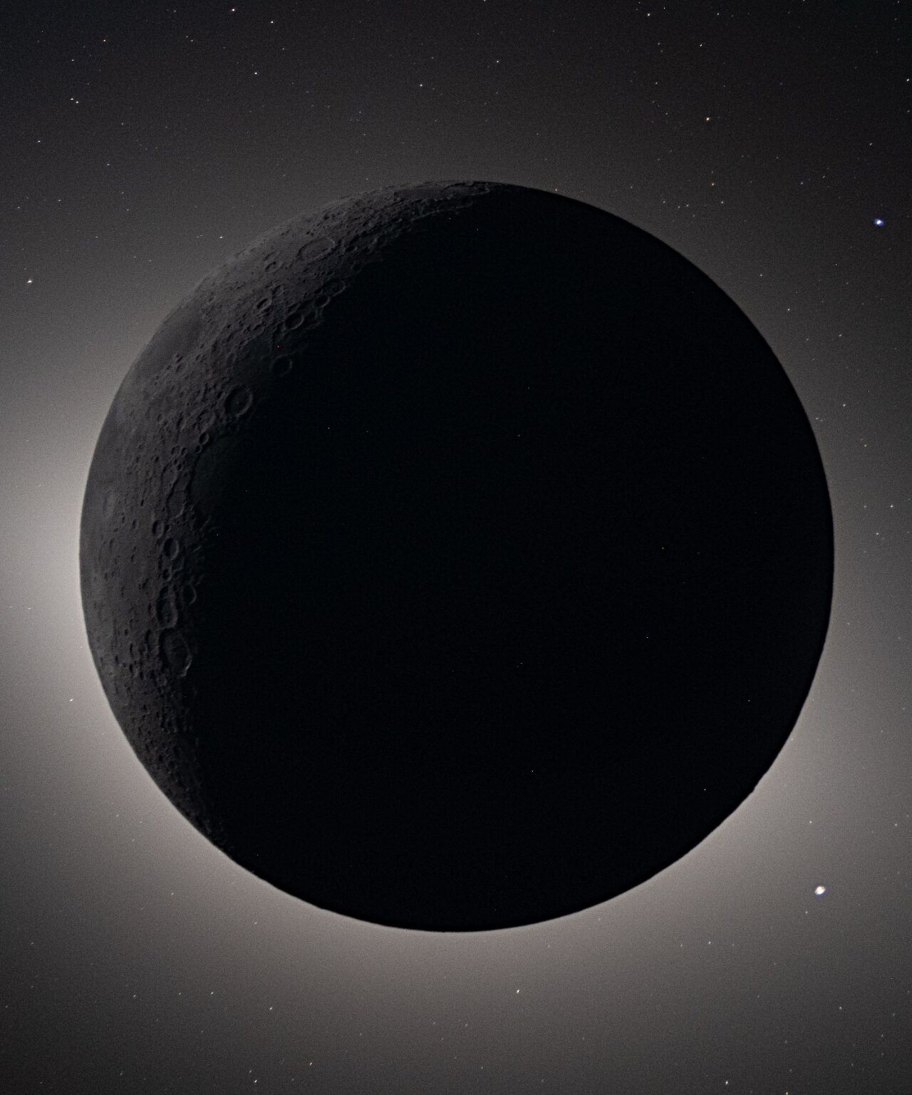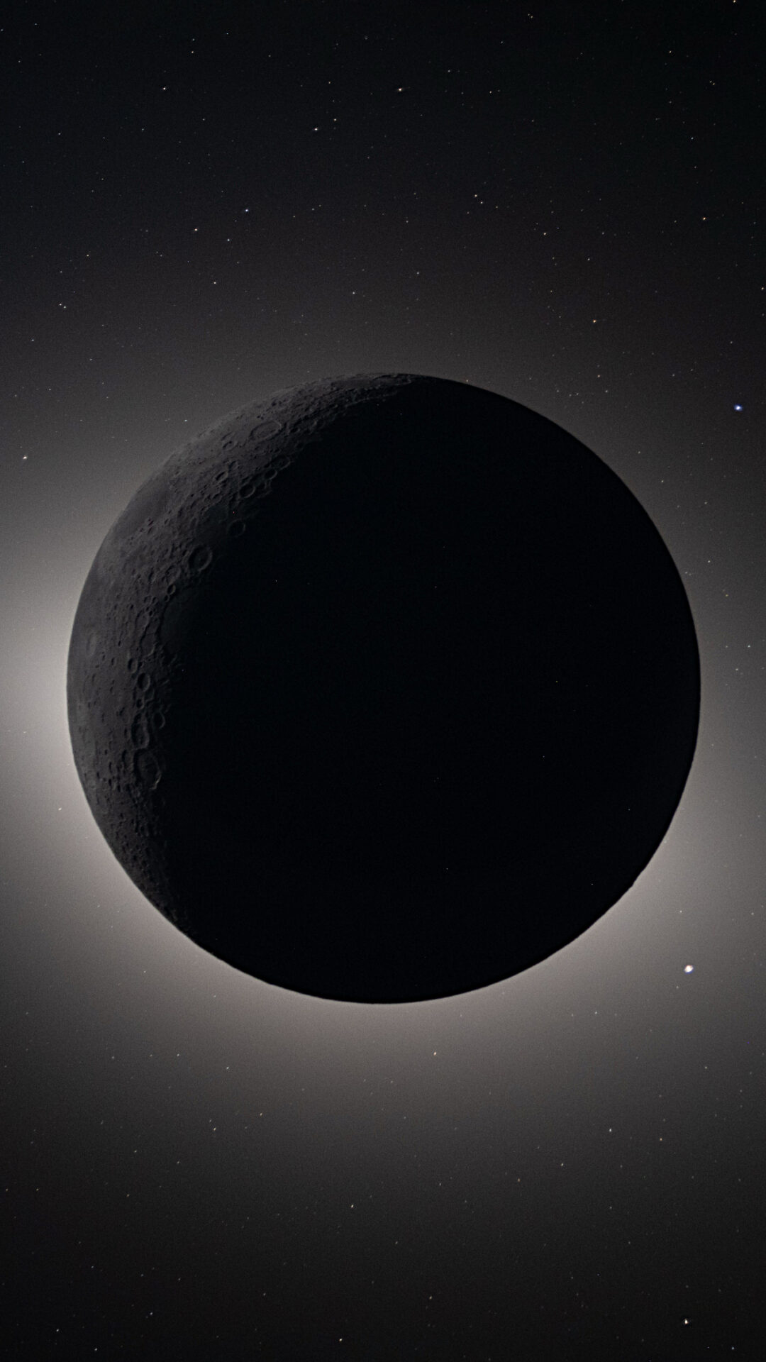 A dark planet dominates the vertical composition against a speckled space background. Soft light around the planet’s edge creates a subtle h…