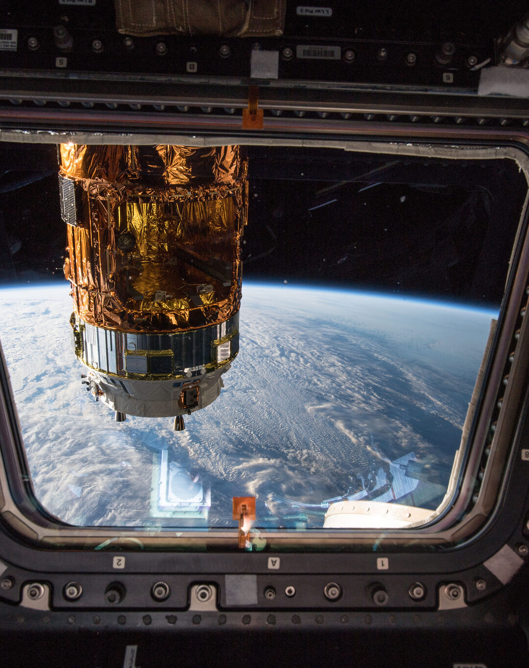 A large cylindrical spacecraft is visible through a rectangular window, positioned above a blurred view of Earth and its atmosphere. The interior frame shows a dark, metallic structure with various cables and panels, contrasting with the bright sunlight reflecting off the spacecraft’s golden thermal blankets.