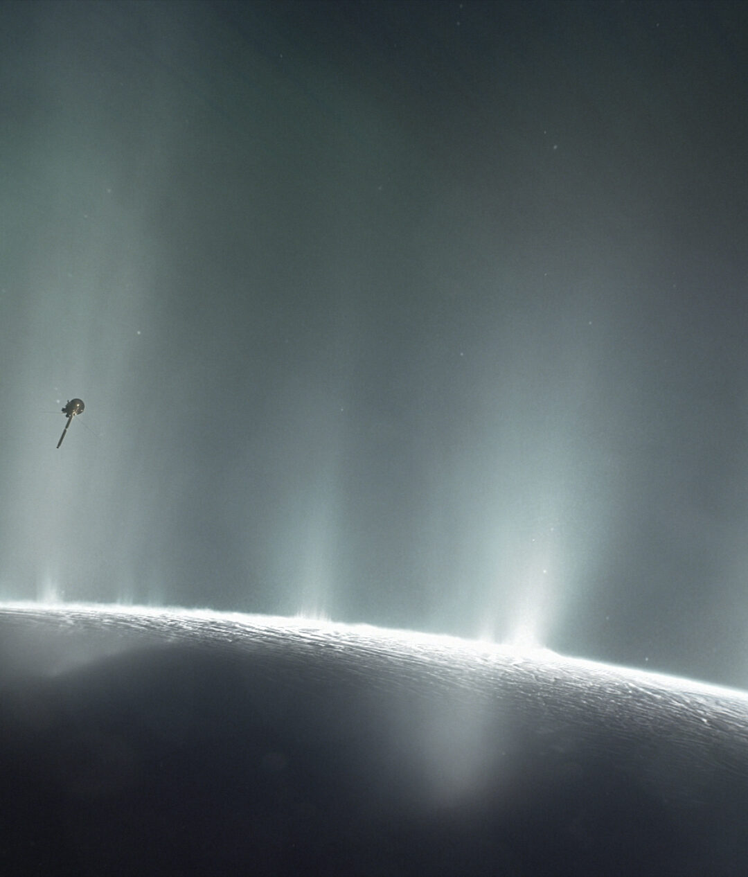 A lone spacecraft silhouette glides over the shadowed surface of a celestial body, with towering light beams erupting from the glowing horizon into black space. High contrast and a faint green tint amplify the sense of solitary deep-space exploration.