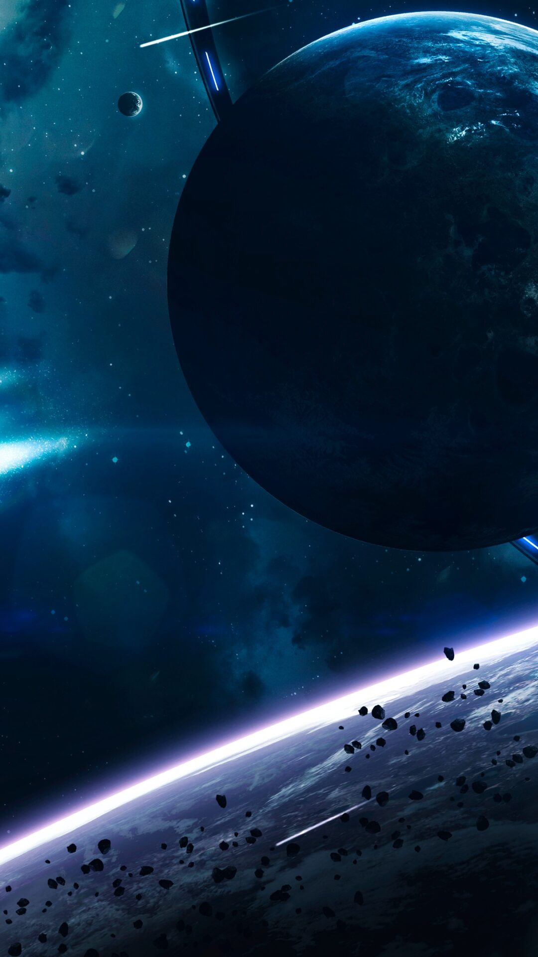 A planet is centered within a bright blue ring structure and a spacecraft flies in the distance. The scene is dark and deep, with a scattered asteroid field and hazy light across the composition.