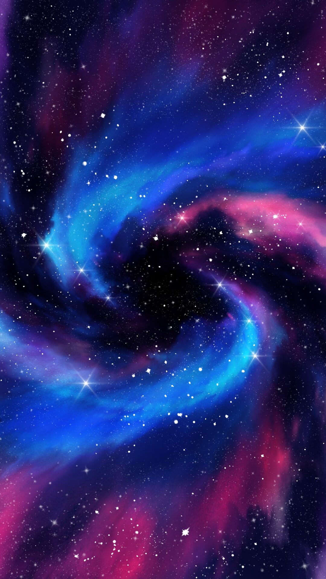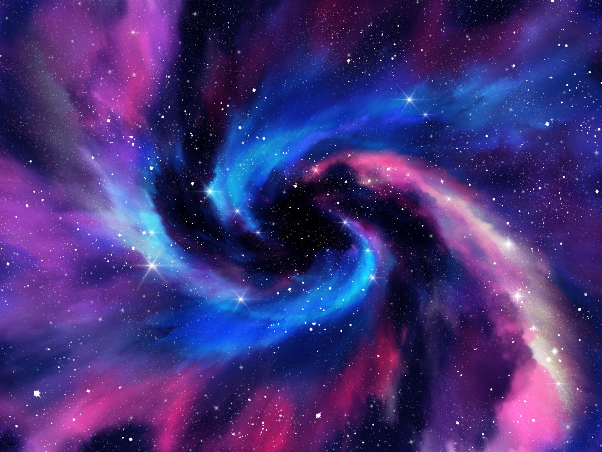 Swirling cosmic gases create a mesmerizing spiral pattern with vibrant blues, purples, and pink hues dancing around a dark galactic center. …