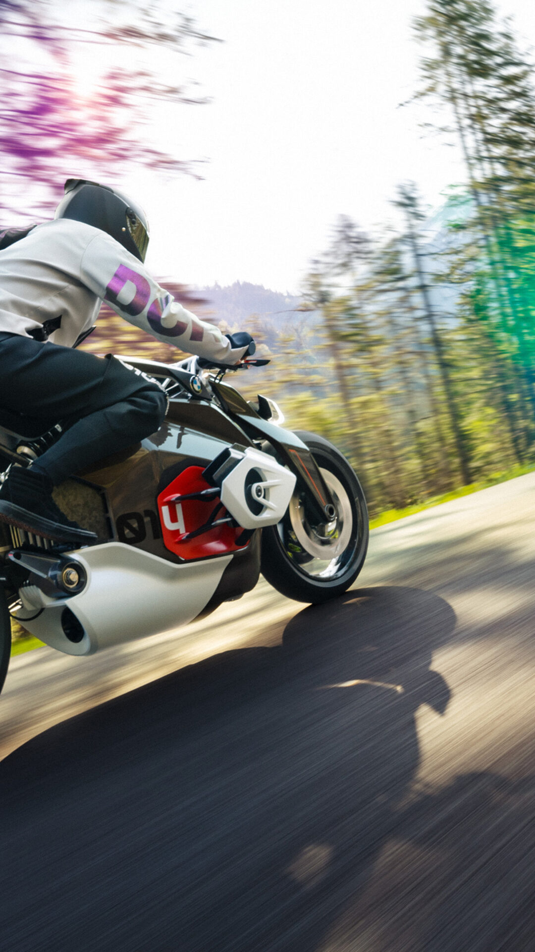 A rider controls a white sport bike on a winding asphalt road through a forested hillside. Motion blur and lens flare create a sense of spee