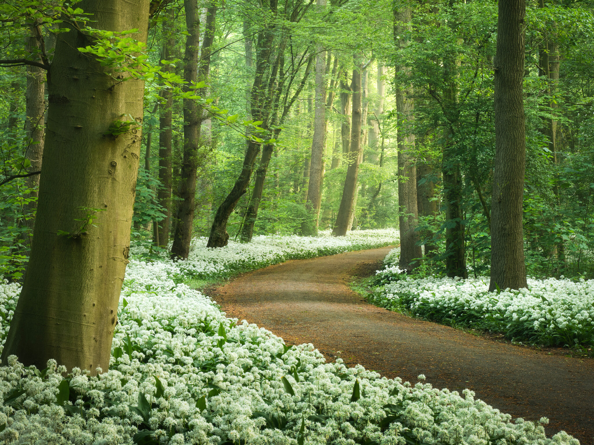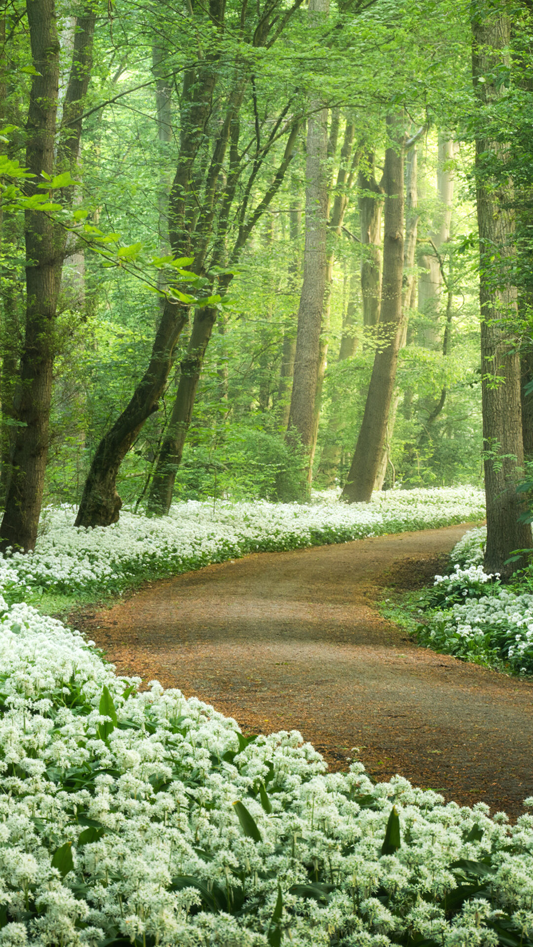 Sunlight filters through vibrant green trees along a winding dirt path bordered by carpets of white wild garlic flowers. This spring forest scene works beautifully for 4K monitors and nature lovers seeking peaceful woodland wallpapers.