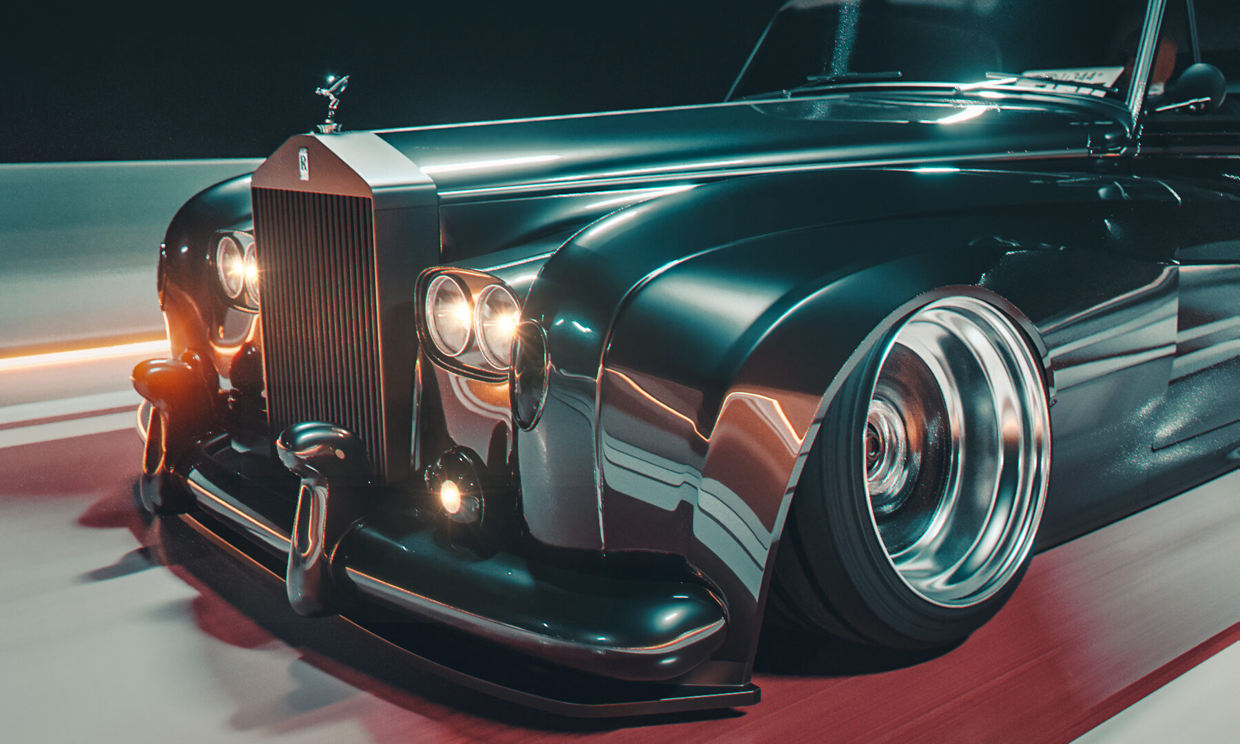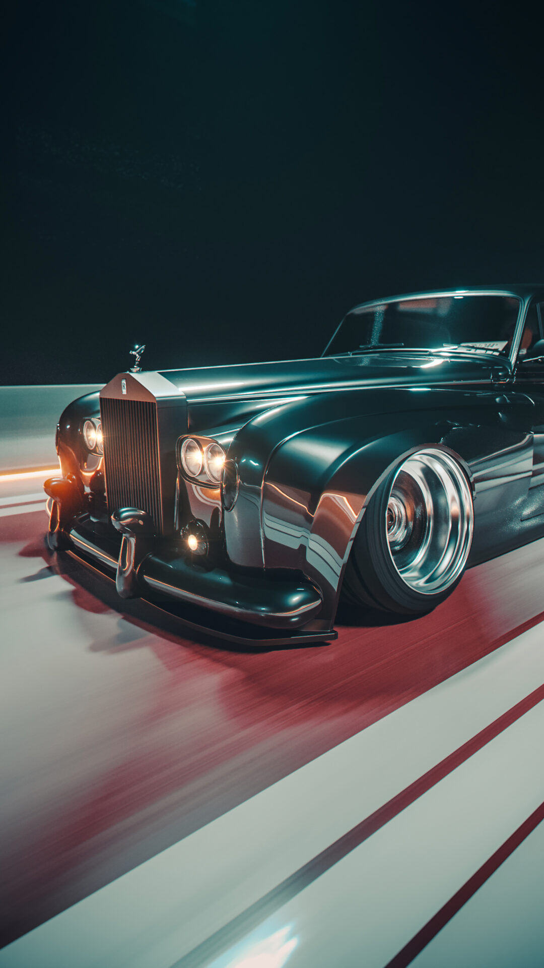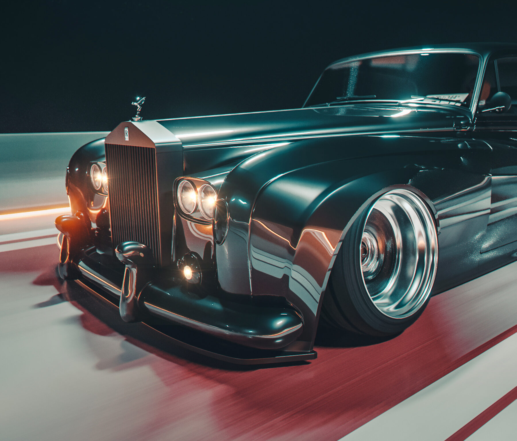 A blacked-out Rolls-Royce Phantom III hugs the track at speed, chrome grille and Spirit of Ecstasy ornament catching the light against a dark, cinematic backdrop. Luxury meets raw aggression in this low-angle shot.