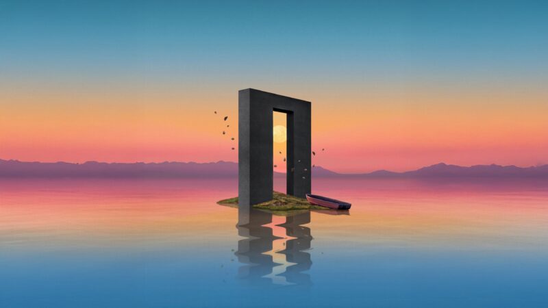A dark mountain range is silhouetted against a speckled night sky. The cool blue tones of the sky contrast with the warm, textured orange an…
