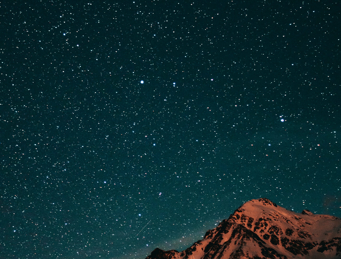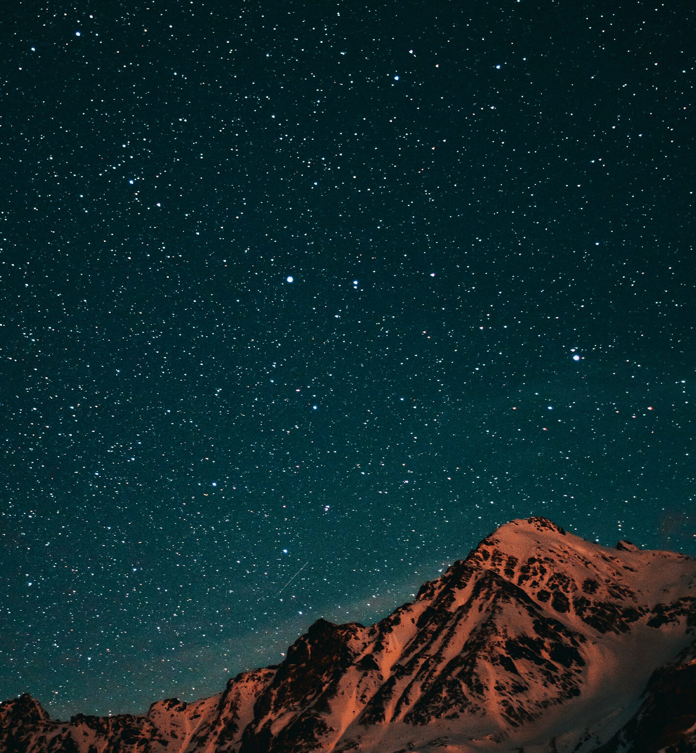 A dark mountain range is silhouetted against a speckled night sky. The cool blue tones of the sky contrast with the warm, textured orange and brown of the rocks.