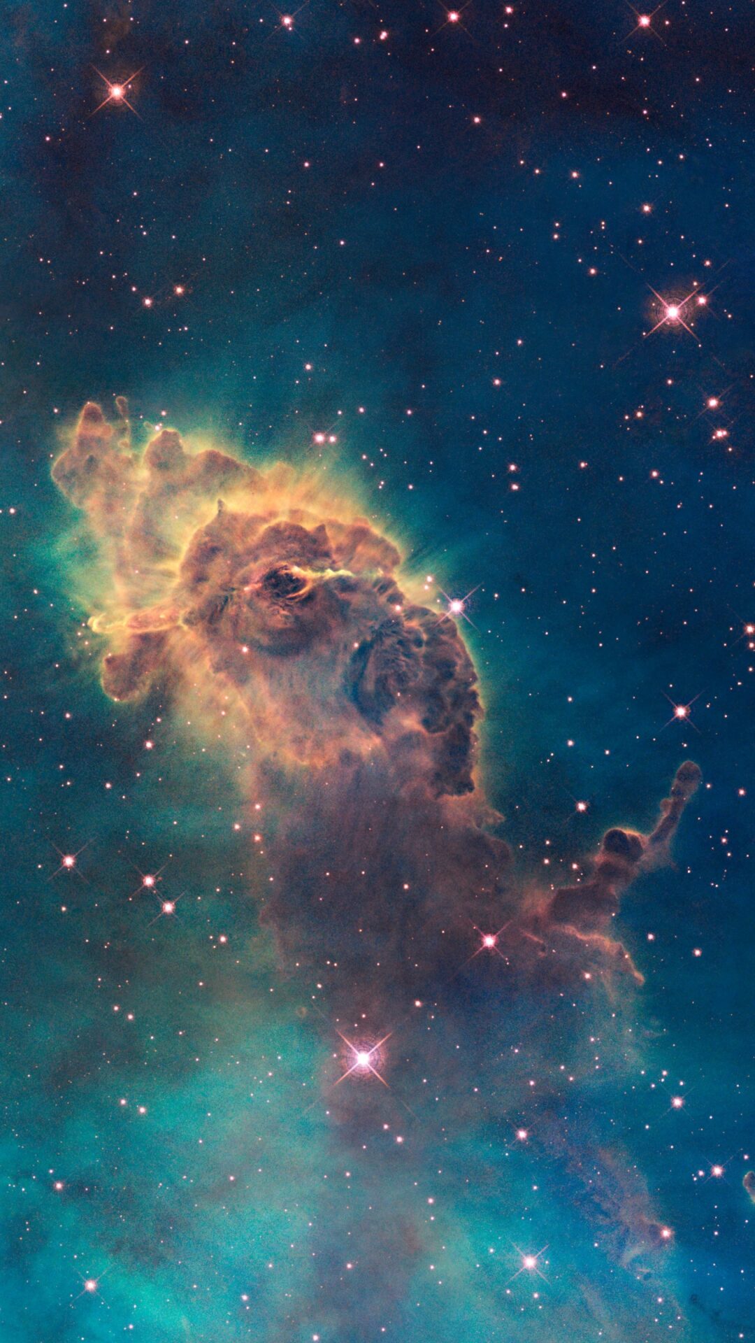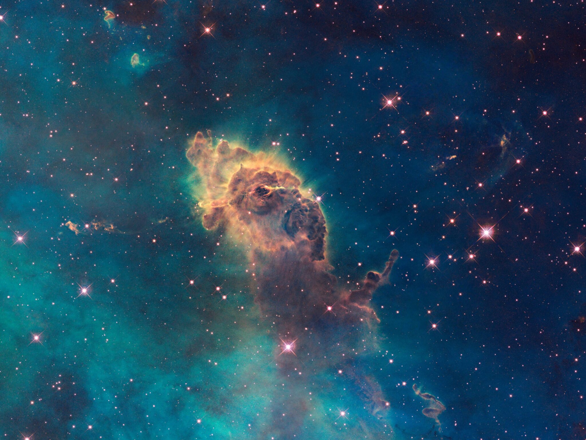 Brilliant orange and yellow gas jets burst through turquoise nebular clouds dotted with bright white stars in this cosmic spectacle. Made for 4K monitors that want to showcase the raw power and beauty of deep space phenomena.