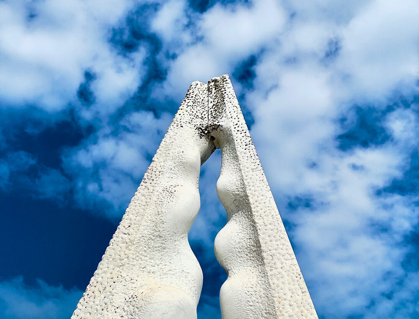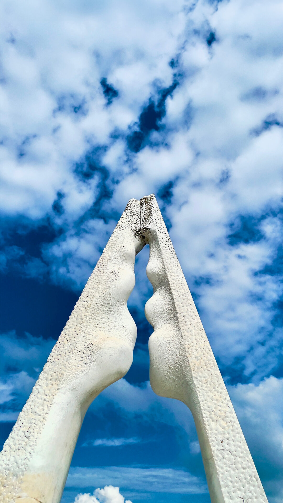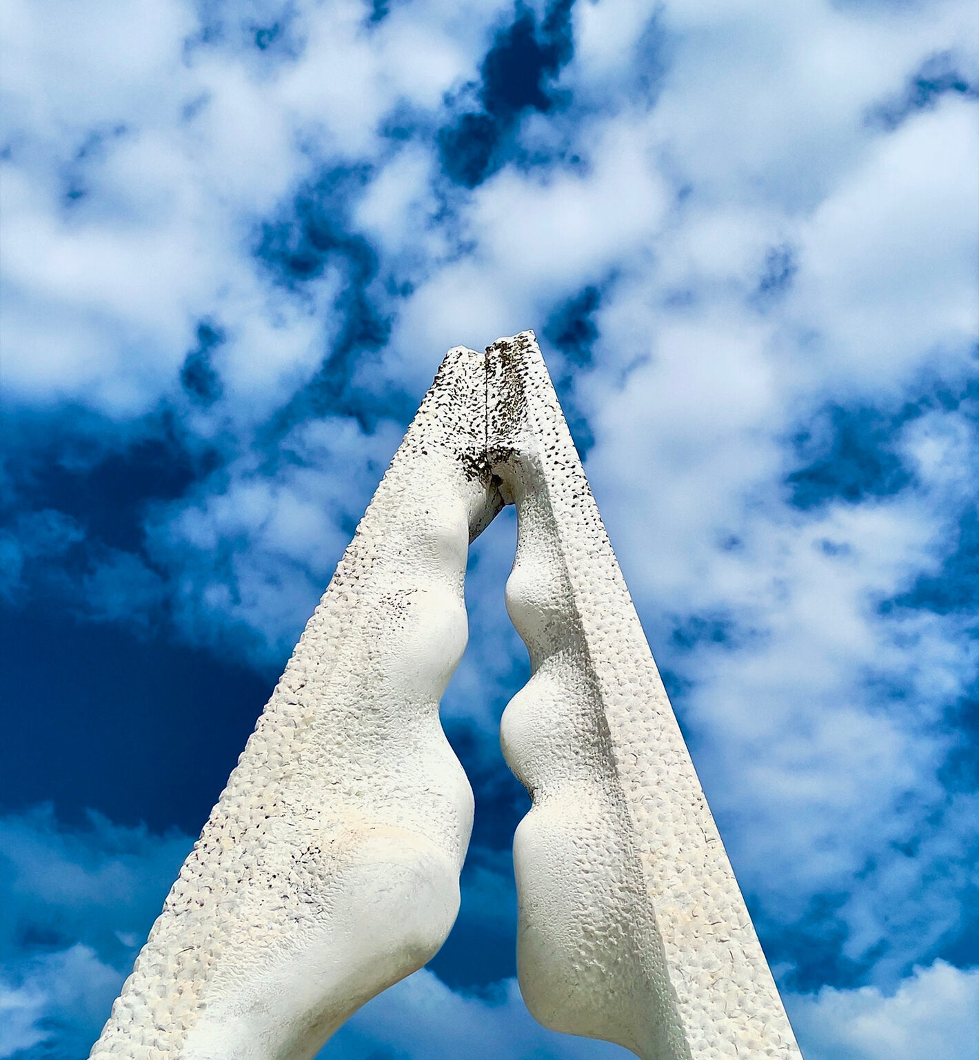 Two sculpted stone faces meet at the apex, forming an arch against a blue sky. Light highlights the rough texture of the stone and the dramatic cloud formations behind it.