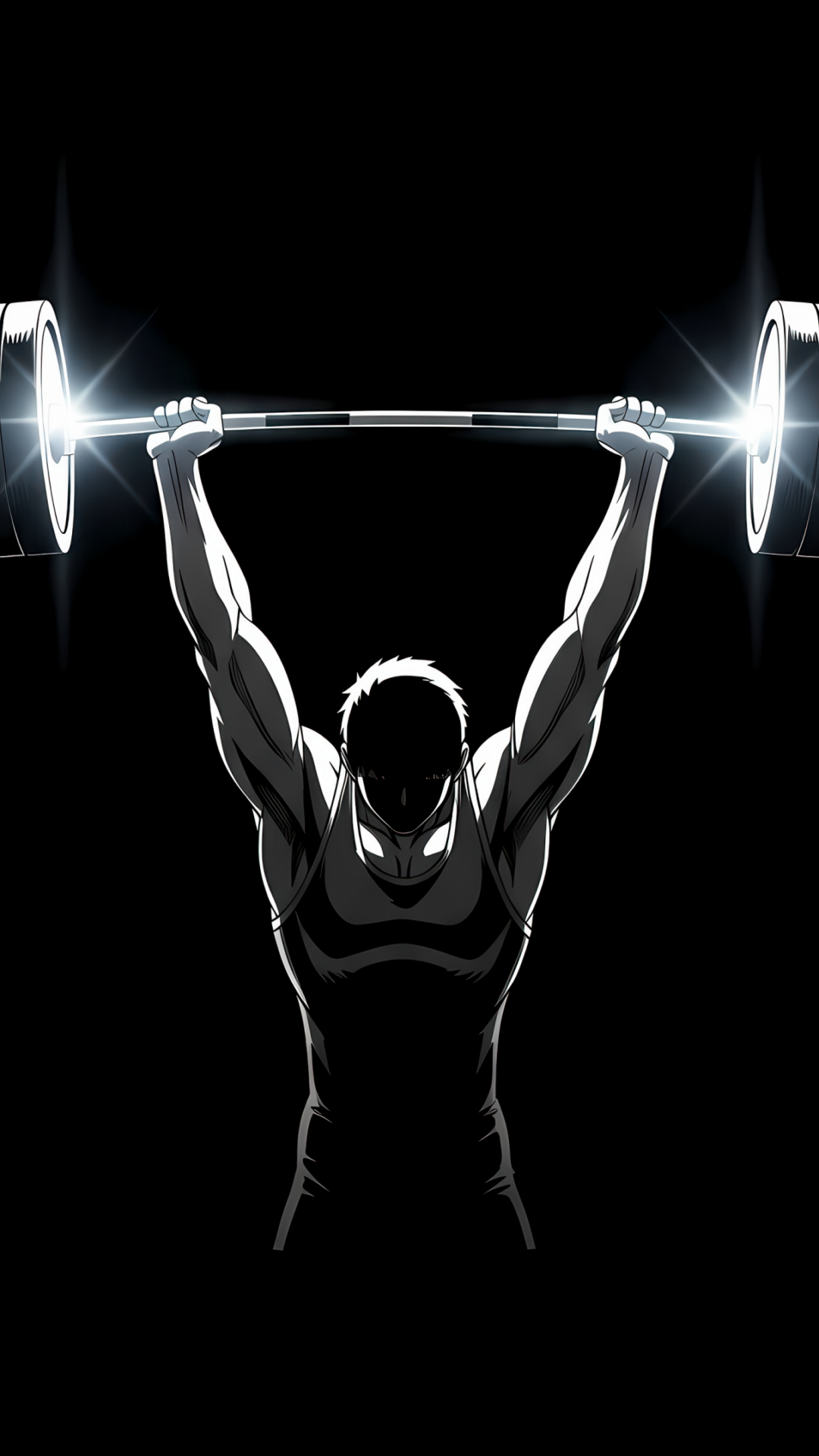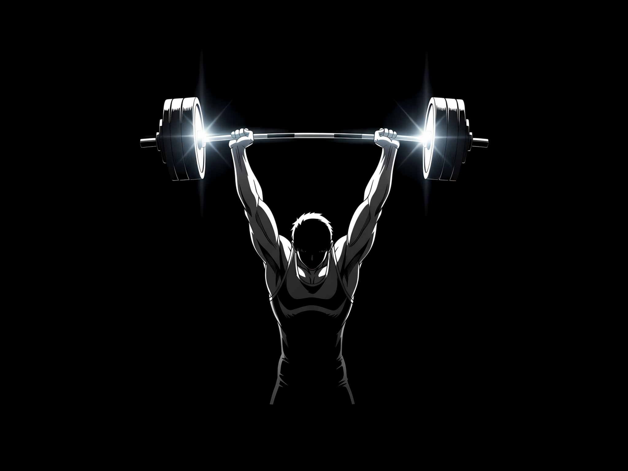 Muscular weightlifter hoisting a barbell overhead with bright white light bursting from the weight plates, all in stark black and white mini