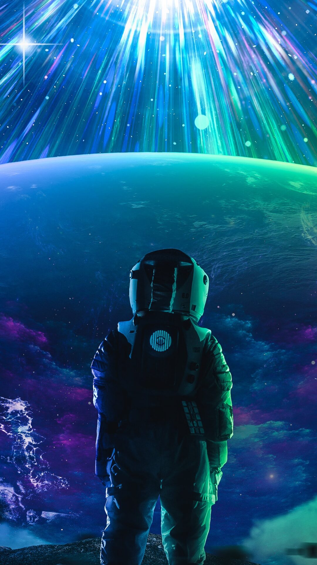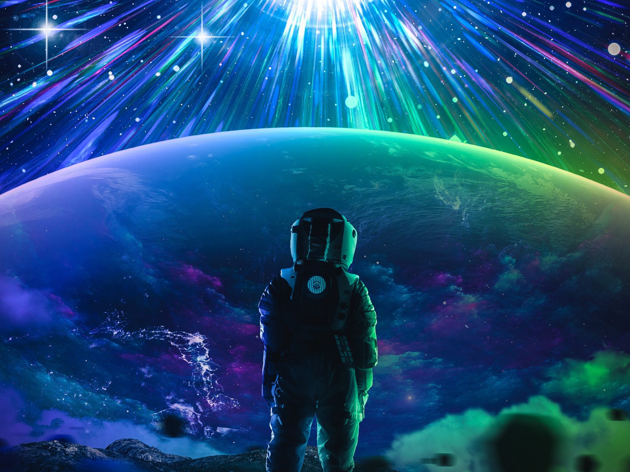An astronaut stands on a rocky surface gazing at a vibrant blue and green planet while brilliant streams of purple, blue and teal light cascade from space above. Made for 4K desktop wallpapers that want some cosmic adventure.