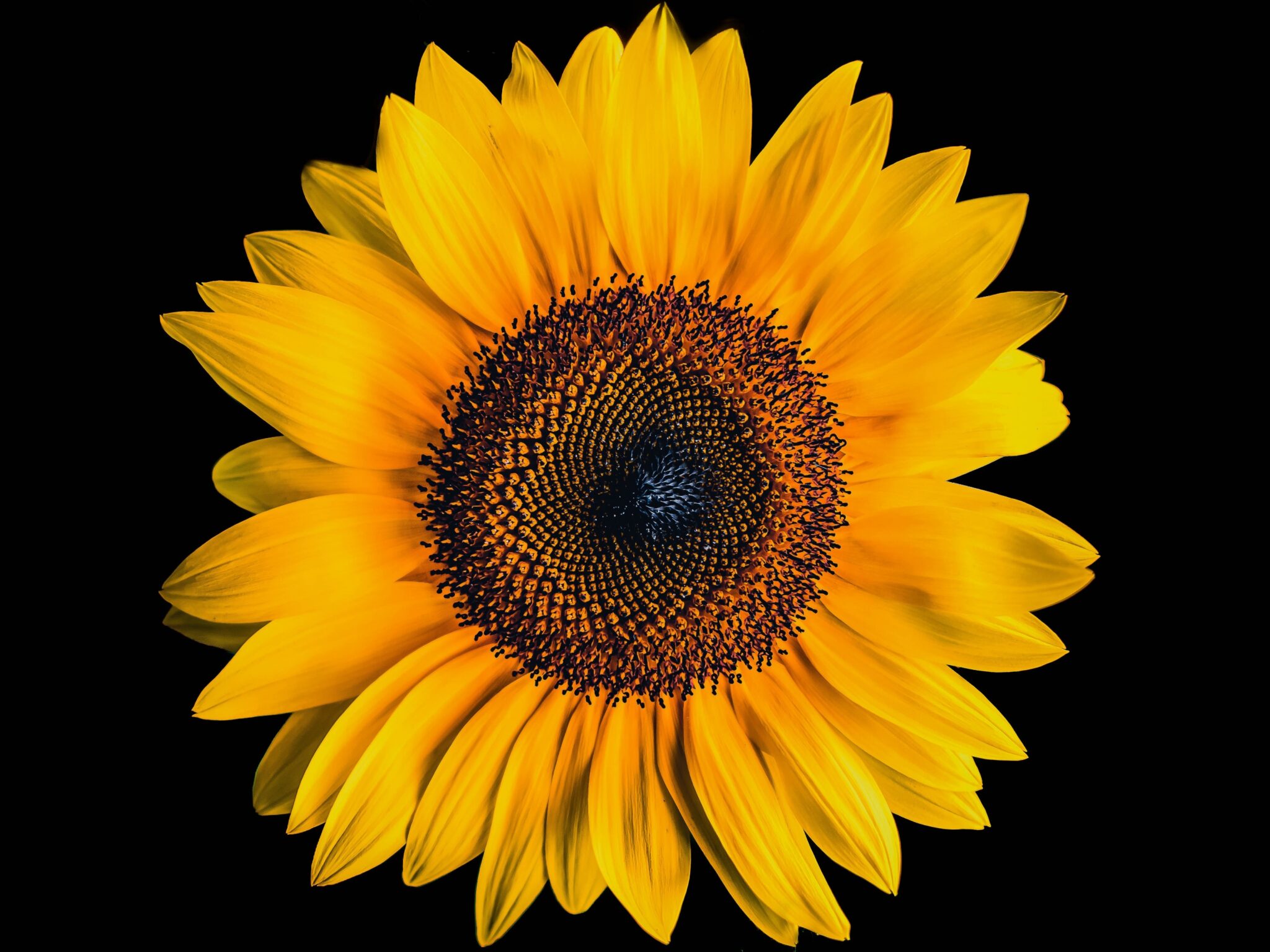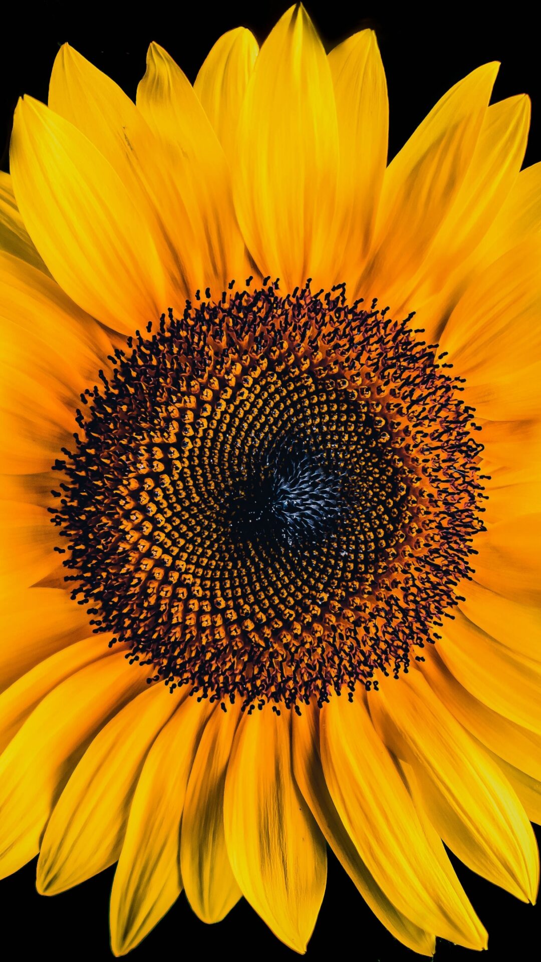A sunflower is centered against a solid black background. The flower’s petals are a bright yellow and its center is filled with a complex, t…