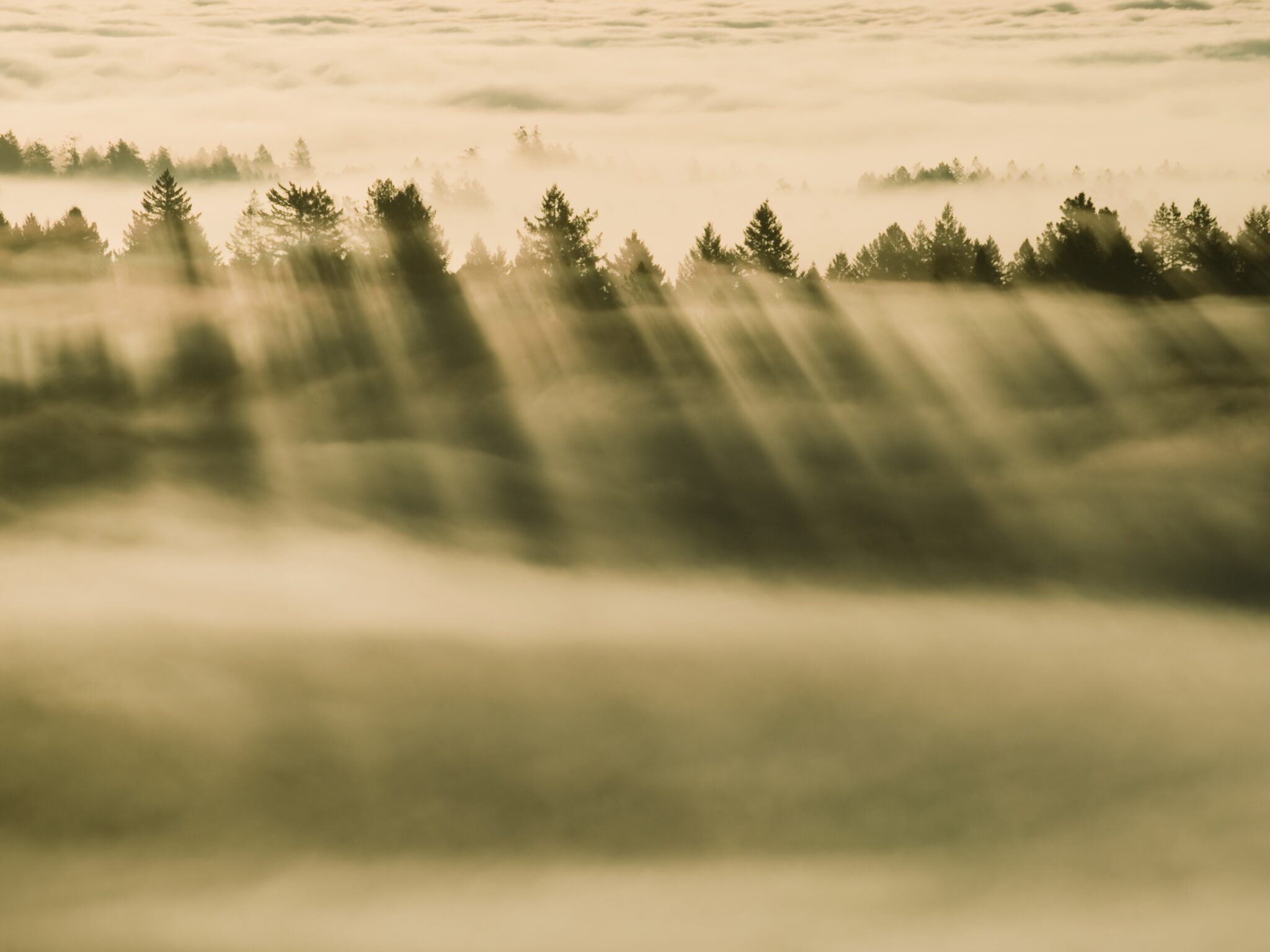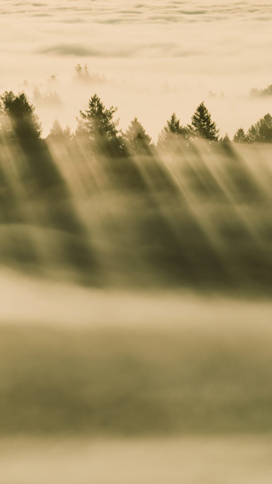 Sunlight filters through a line of evergreen trees, casting long golden rays across layers of soft morning fog in warm sepia and cream tones…