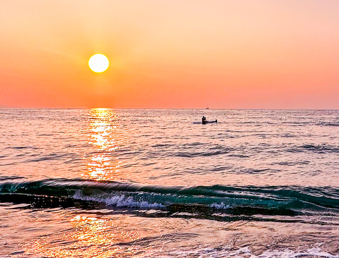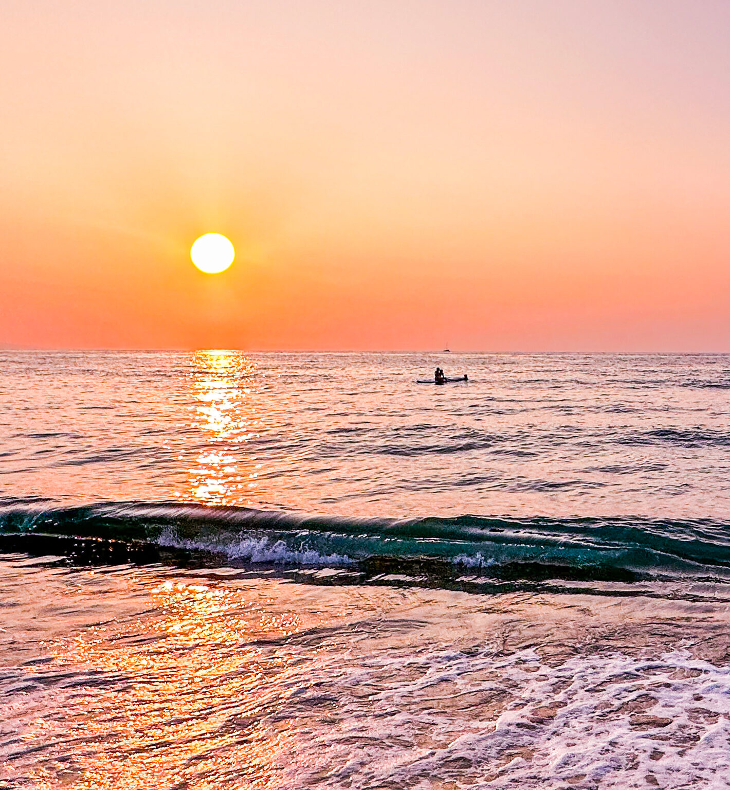 A calm ocean scene stretches to the horizon with a setting sun. The golden light reflects off the water and creates a path towards a distant swimmer.