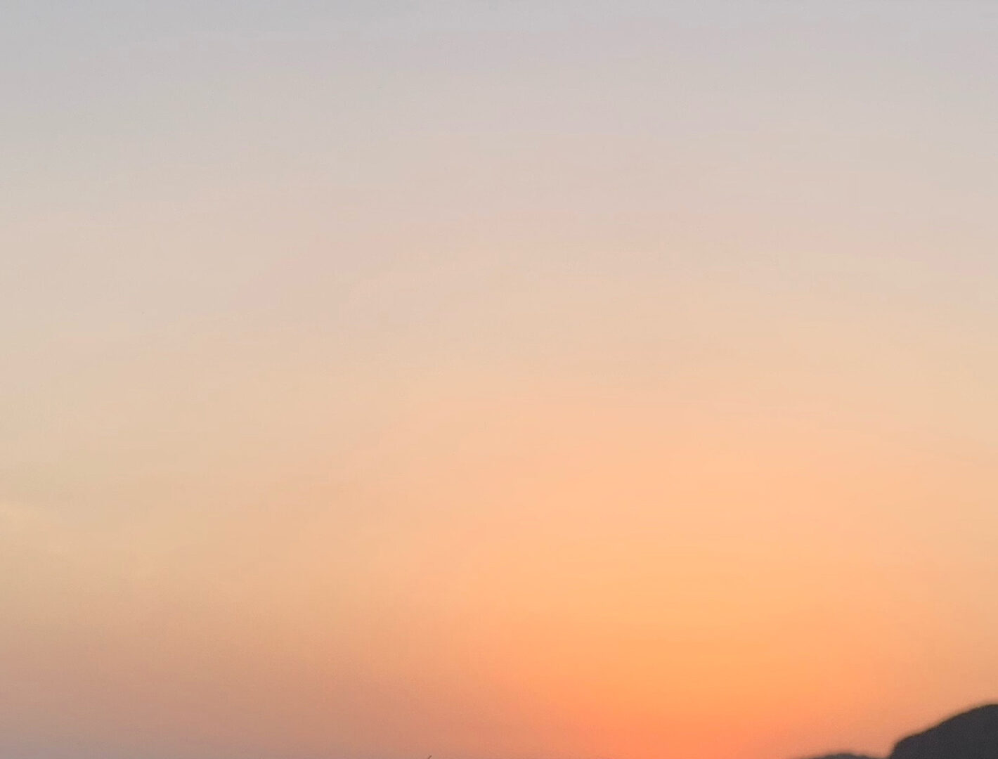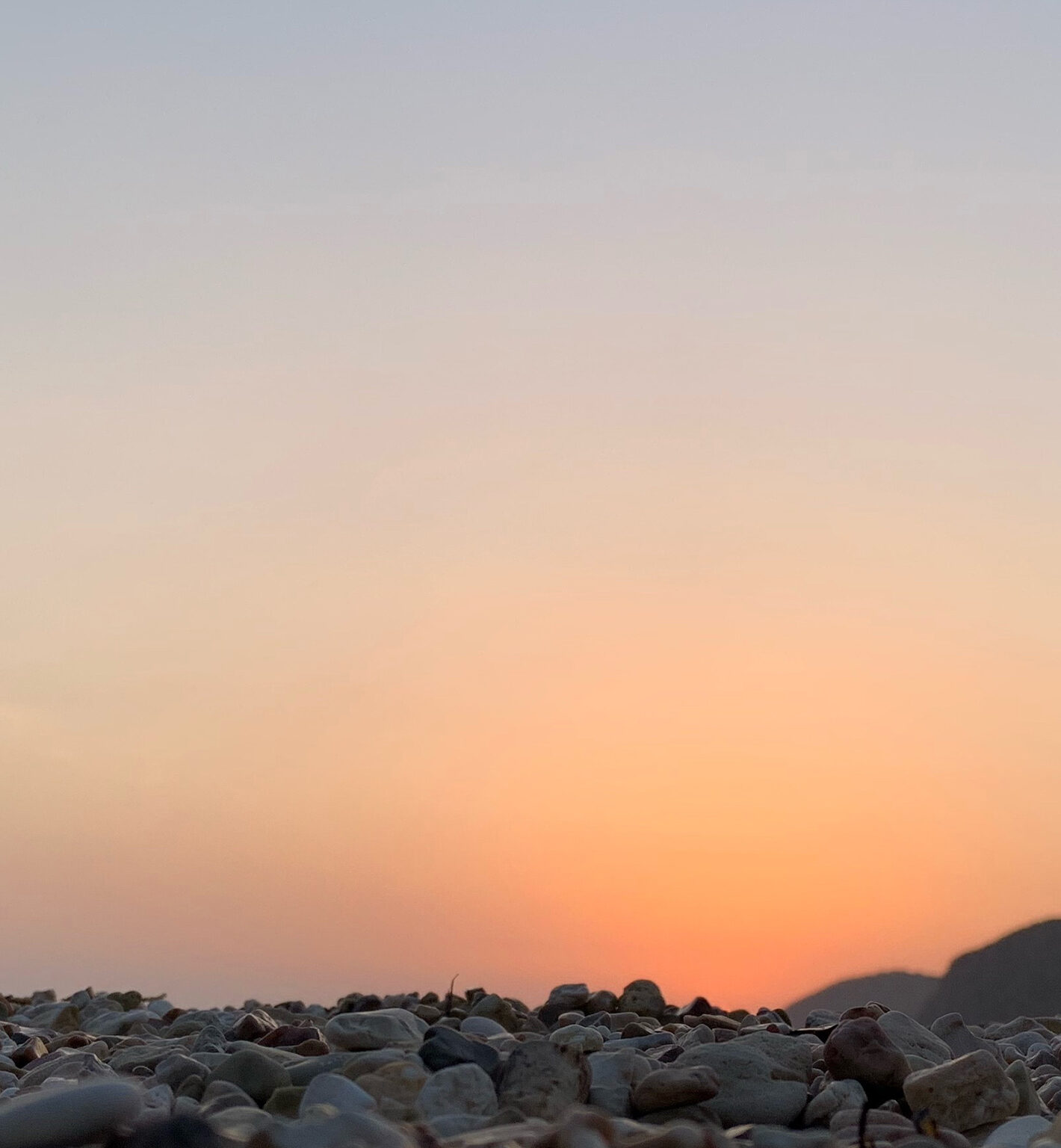 A shoreline with light-colored rocks fills the lower portion of the frame, leading to a wide, open sky. The horizon displays a gradient of orange and pale blue tones, suggesting a calm evening light.