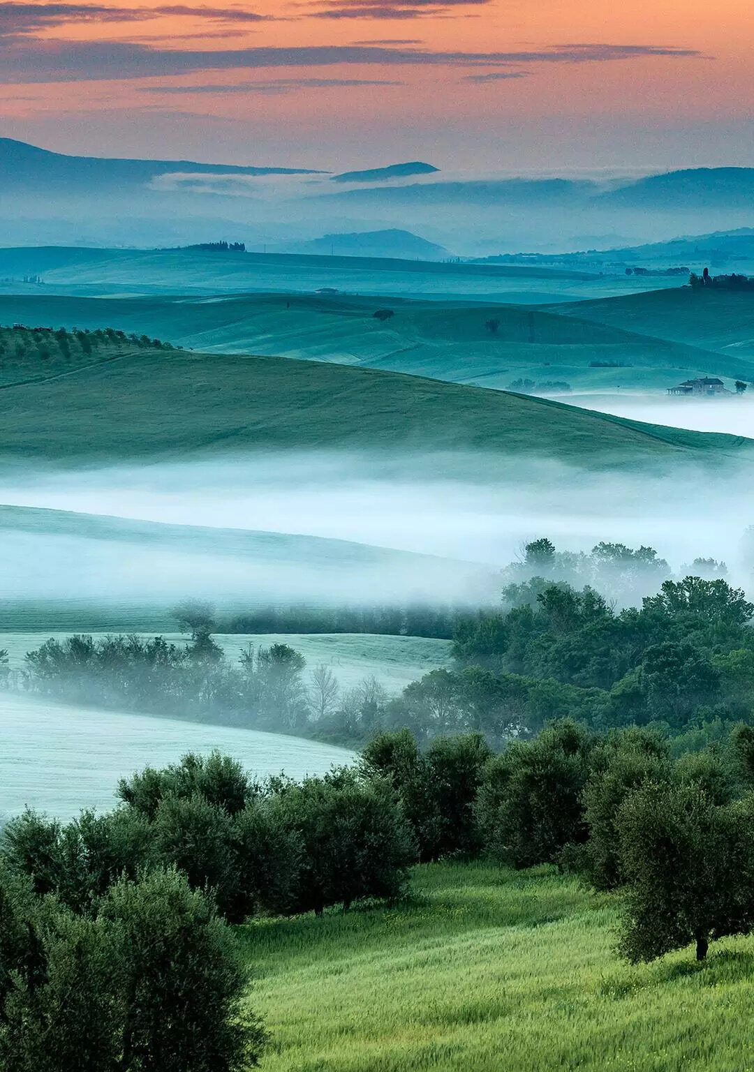Green rolling hills fill the frame, receding into a distant mountain range filled with low-lying mist. Soft gradients of orange and teal in