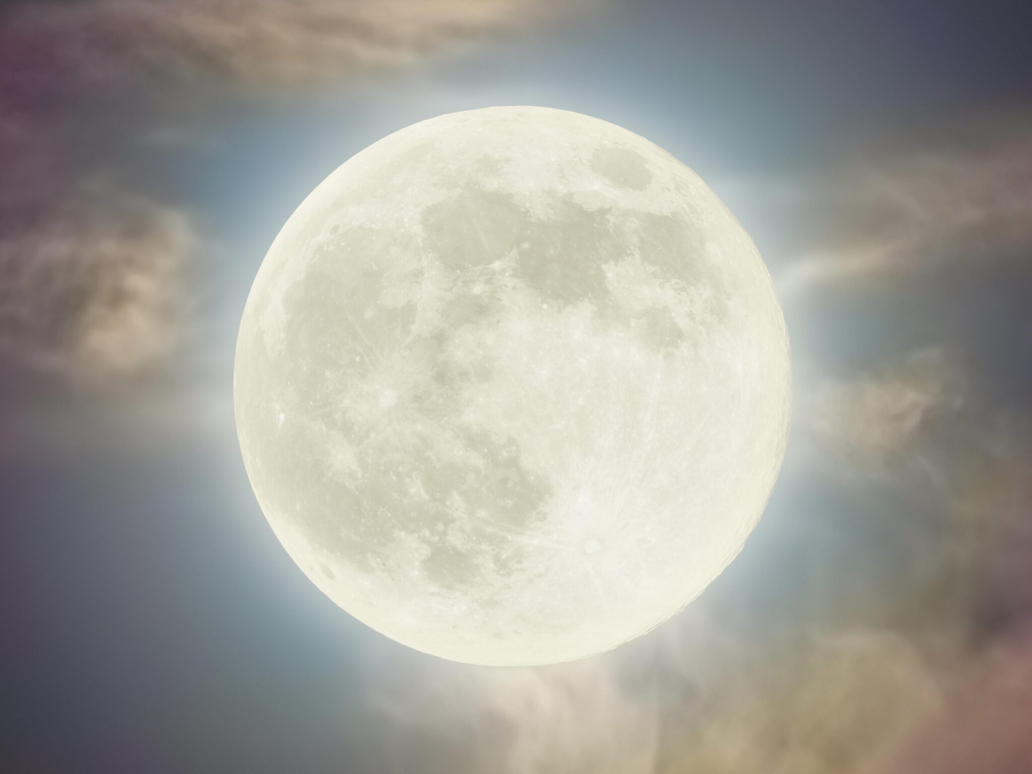Bright white full moon glows through wispy clouds with soft purple and golden hues scattered across the dramatic sky. Works beautifully for desktop wallpapers on widescreen monitors.