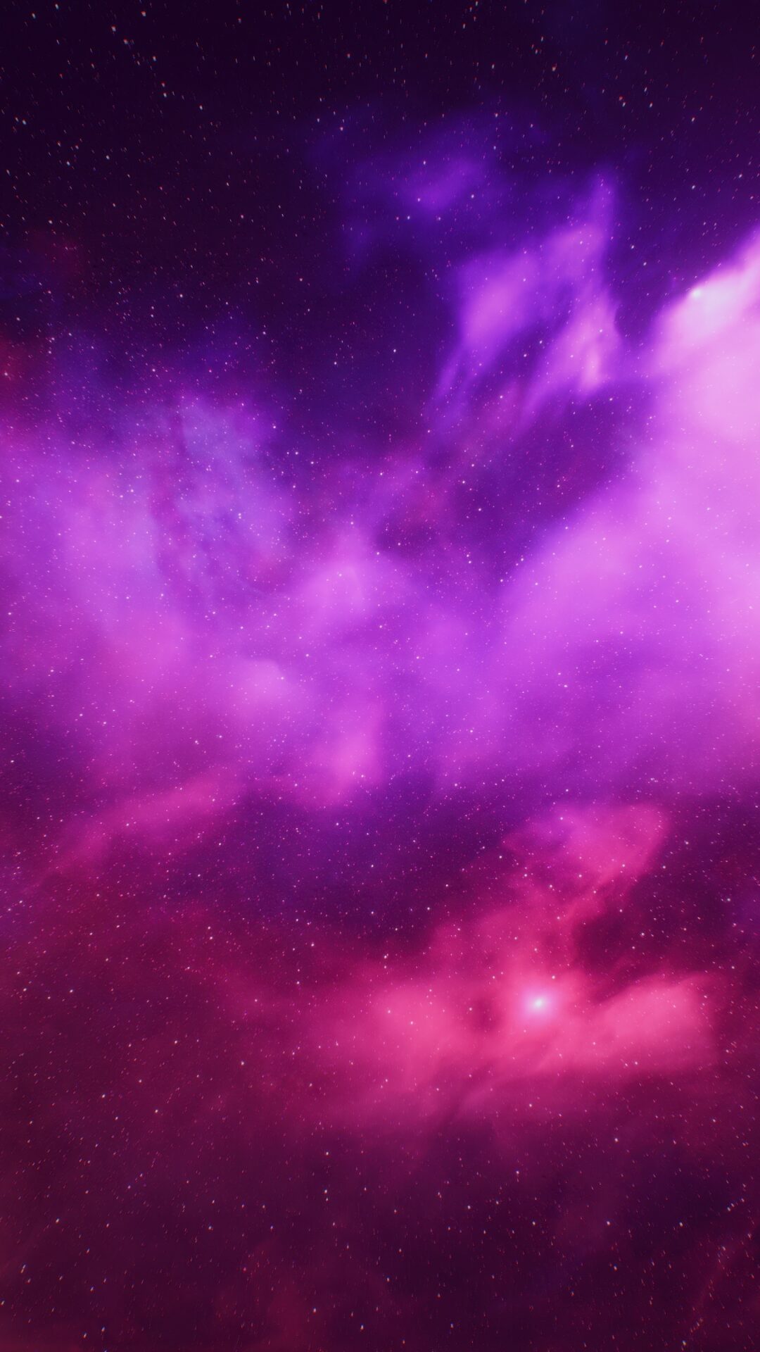 Vibrant purple and magenta cosmic clouds swirl through deep space with warm orange and pink hues illuminating the starry darkness. This cele…