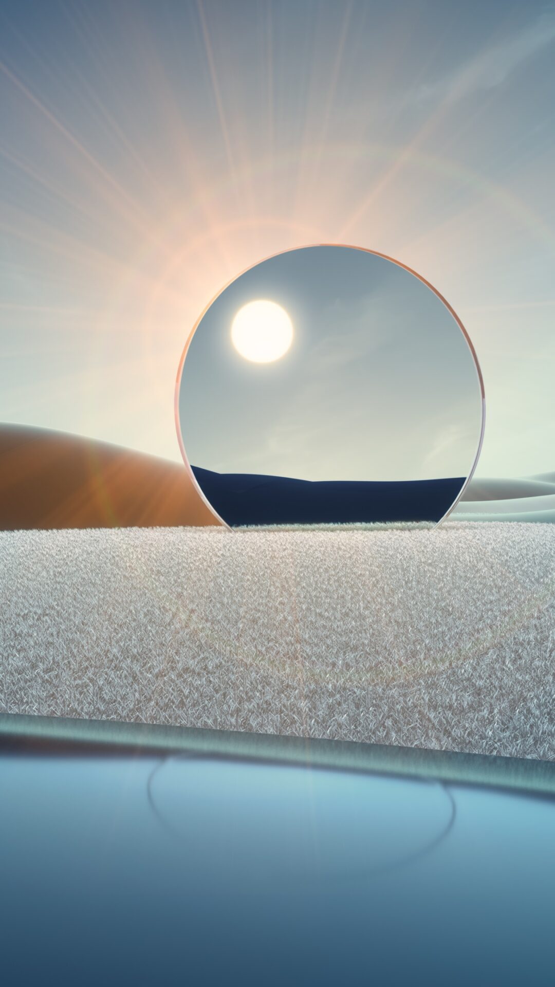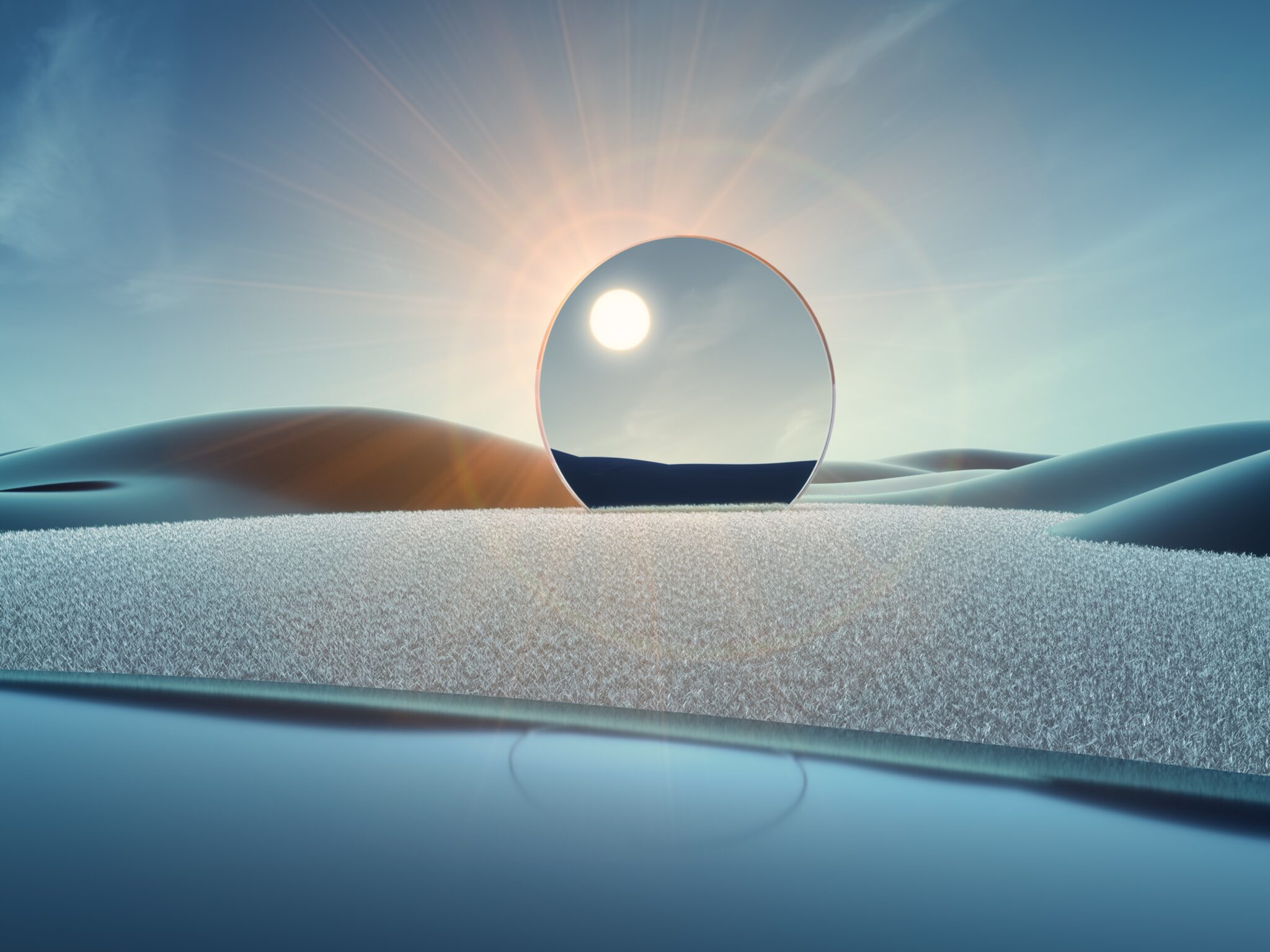Smooth desert dunes stretch endlessly under bright blue skies, with a translucent sphere reflecting warm golden sunlight in the center of th
