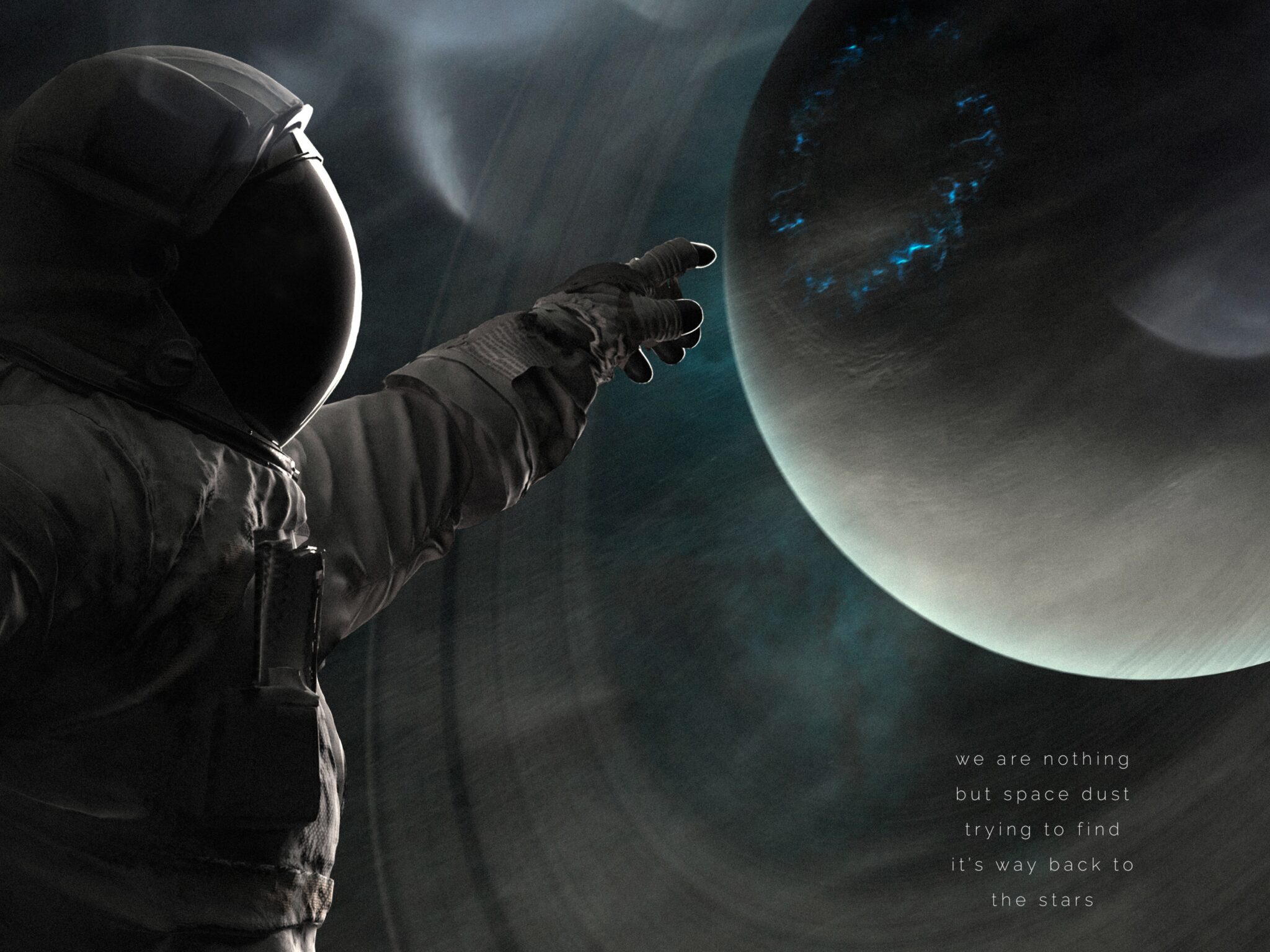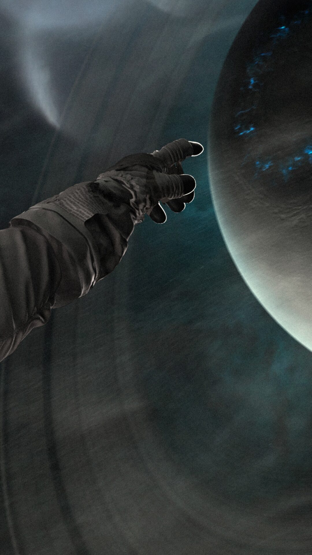Dark-suited astronaut reaches toward massive planets in moody teal and gray space, with glowing blue accents cutting through the cosmic dust