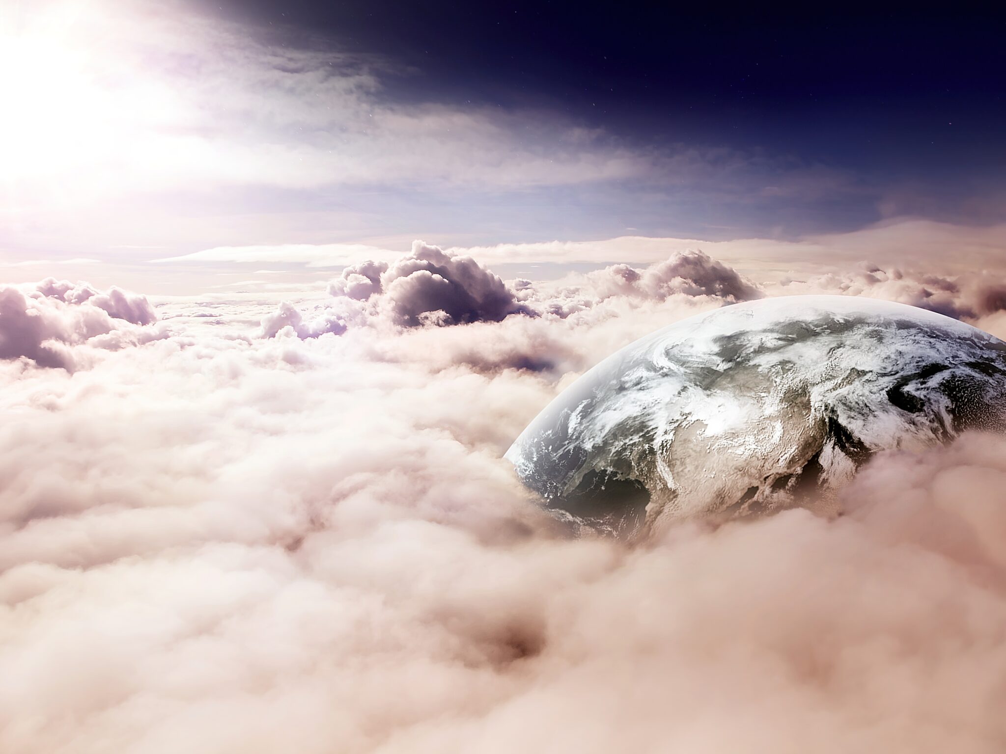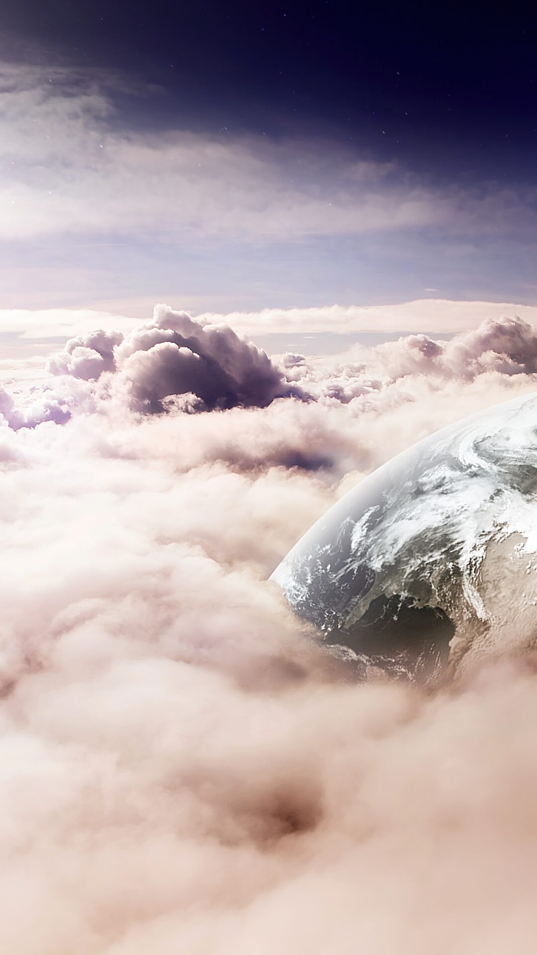 Earth emerges through swirling pink and purple clouds against a dramatic stormy sky in this dreamlike digital composition. Made for 4K monit…