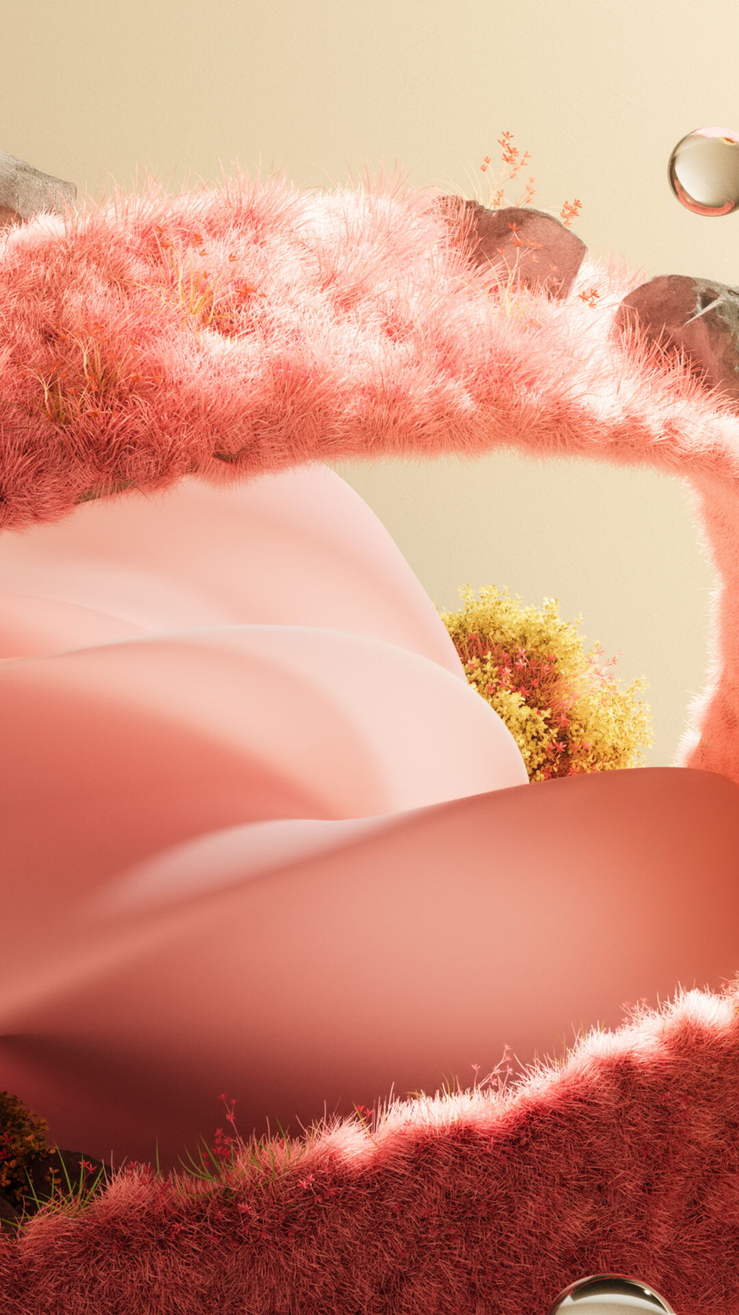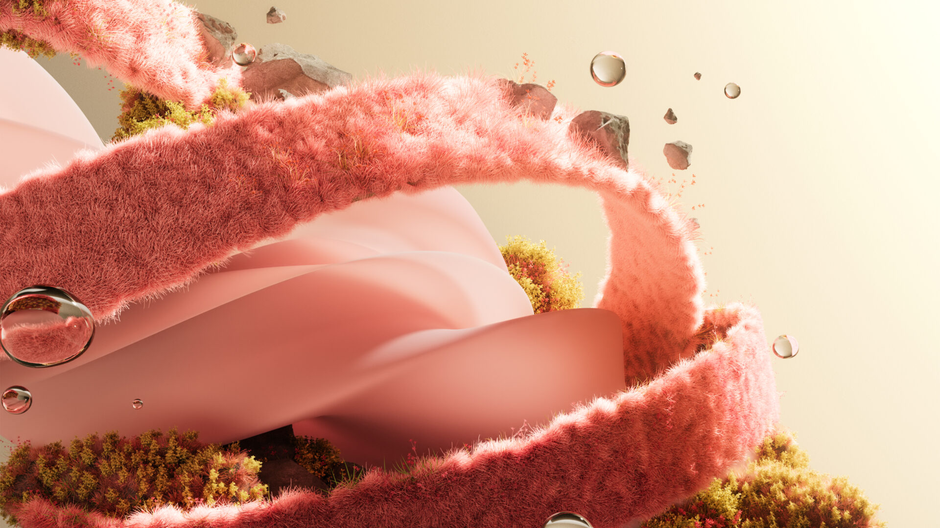 Soft pink furry swirls twist around smooth coral shapes with patches of golden moss and floating water droplets against a warm cream background. For 4K monitors if you want something abstract and dreamy on your desktop.