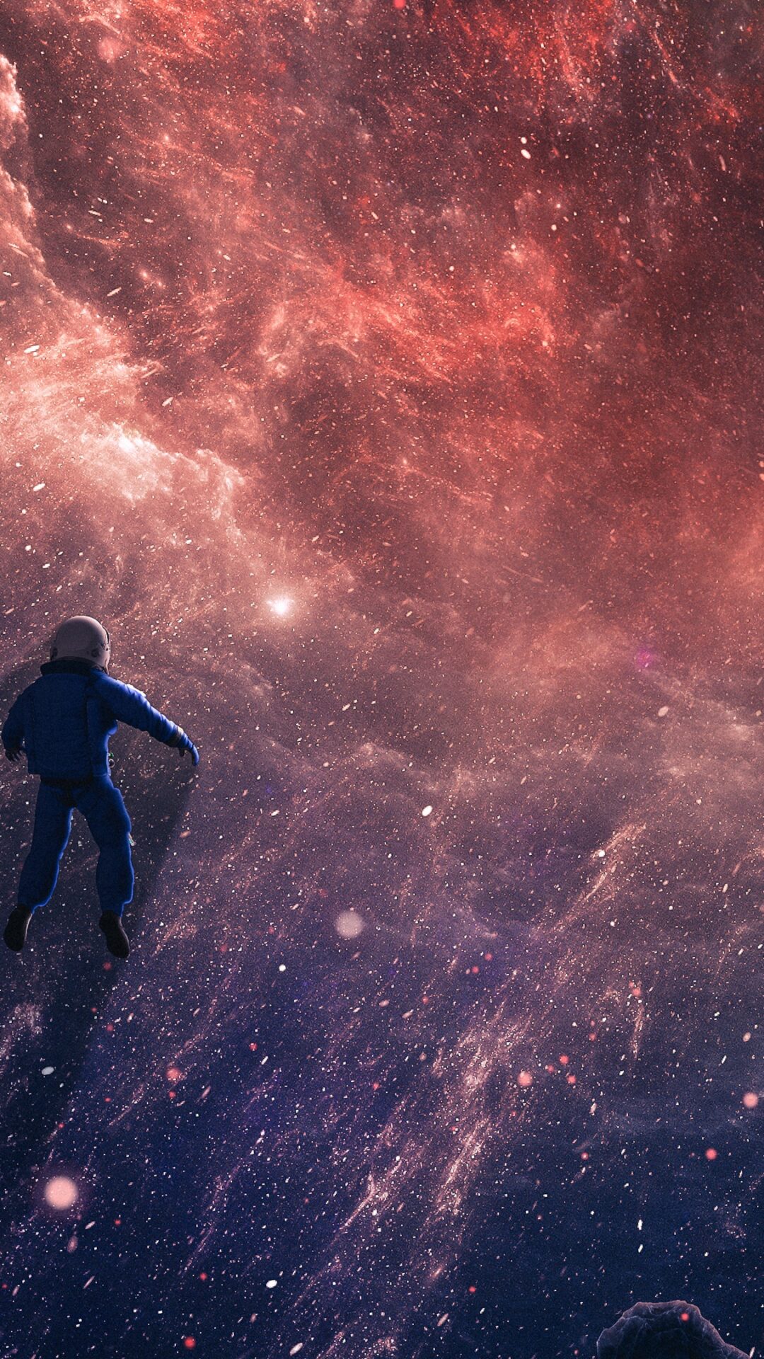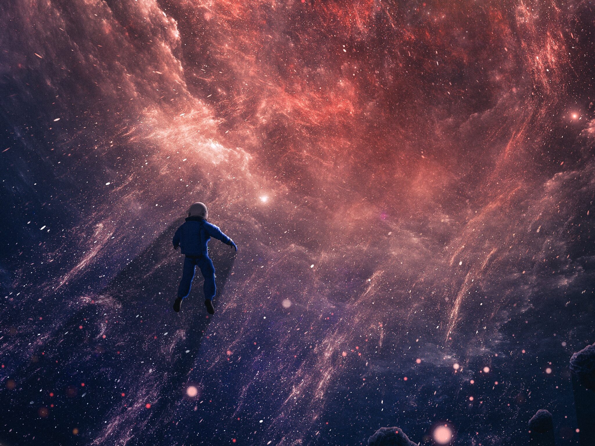 An astronaut floats through a cosmic nebula painted in deep reds, purples, and pink hues with scattered planets visible in the distance. Thi…