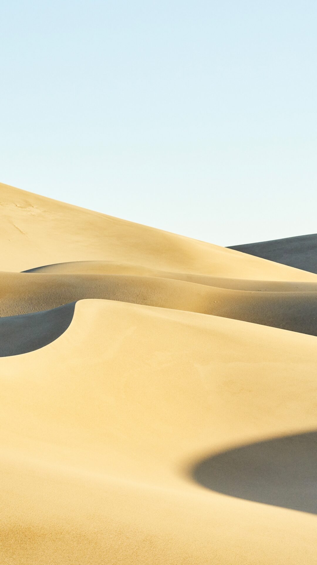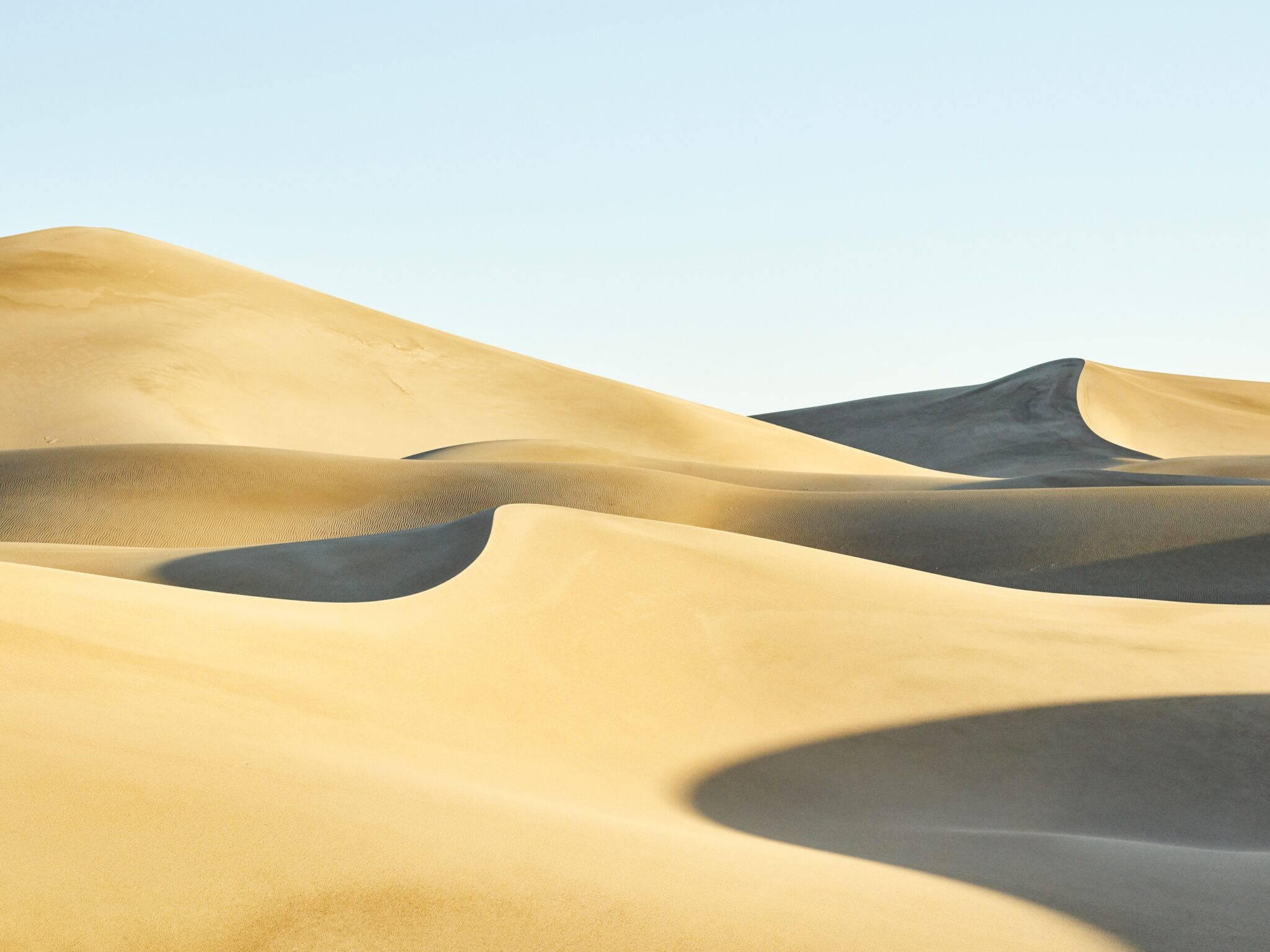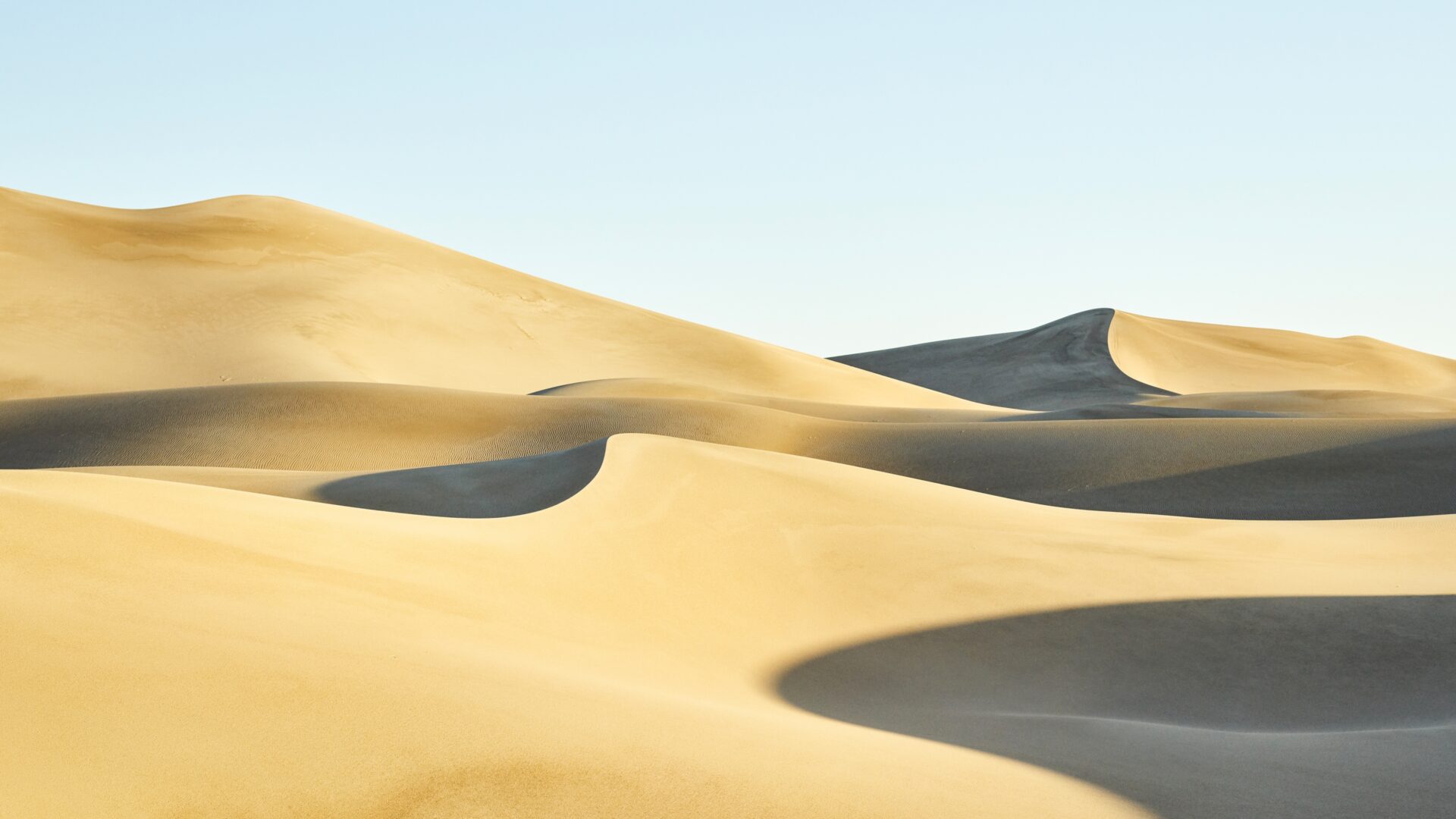 Golden sand dunes with soft curves and deep shadowed valleys under a pale blue sky, showing that classic macOS Mojave look. For 4K monitors …