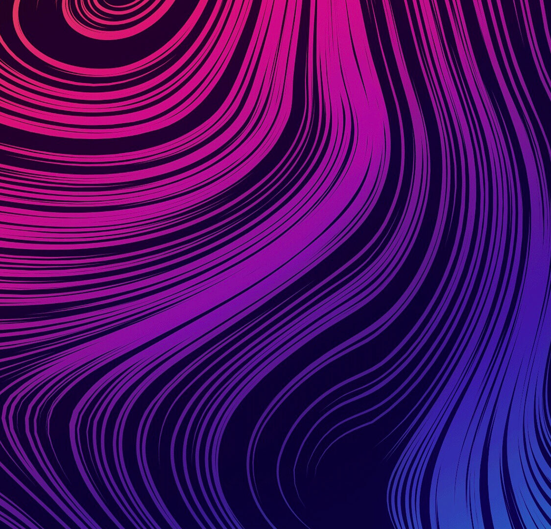 Abstract lines in shades of orange, pink, and blue swirl across a dark background. The tightly spaced lines create a sense of depth with a s…