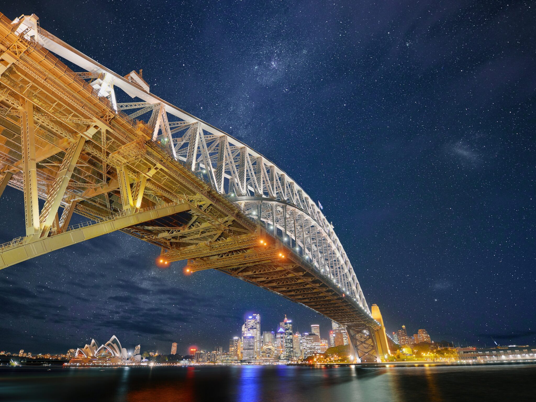 An arch bridge dominates the view over a city skyline and dark water. Soft orange lights illuminate the steel structure and reflect on the surface below, contrasting with the starry night sky.