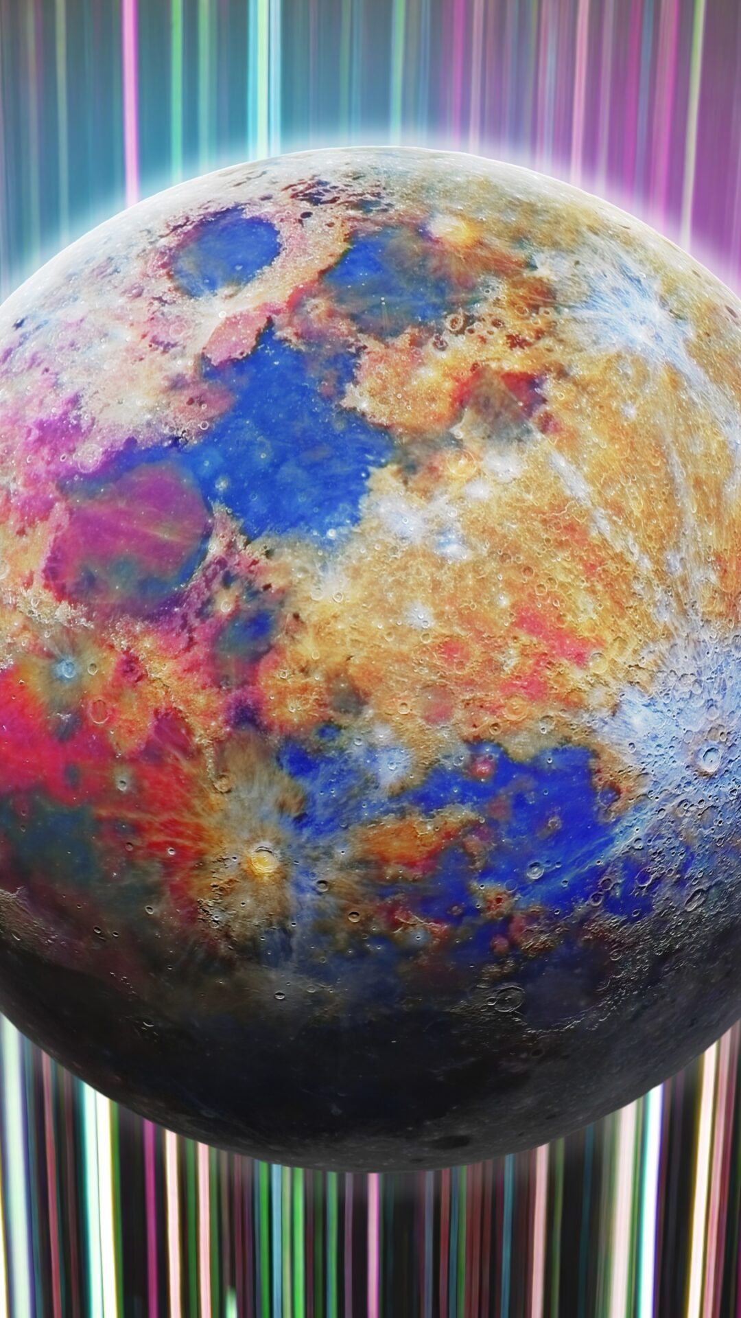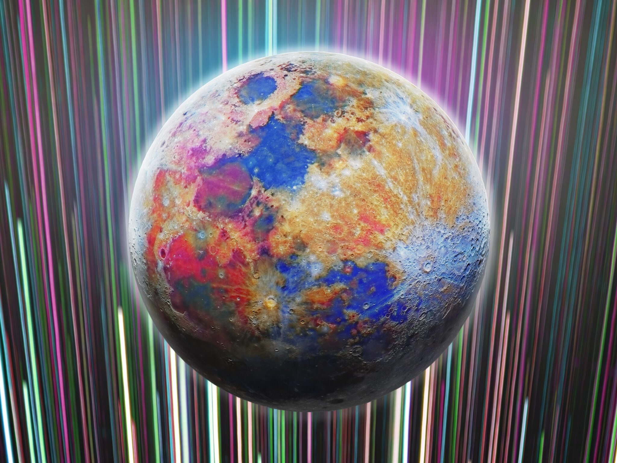 Vibrant neon streaks in pink, blue, and green cascade behind a colorfully enhanced moon displaying rich blues, reds, and golden hues across …