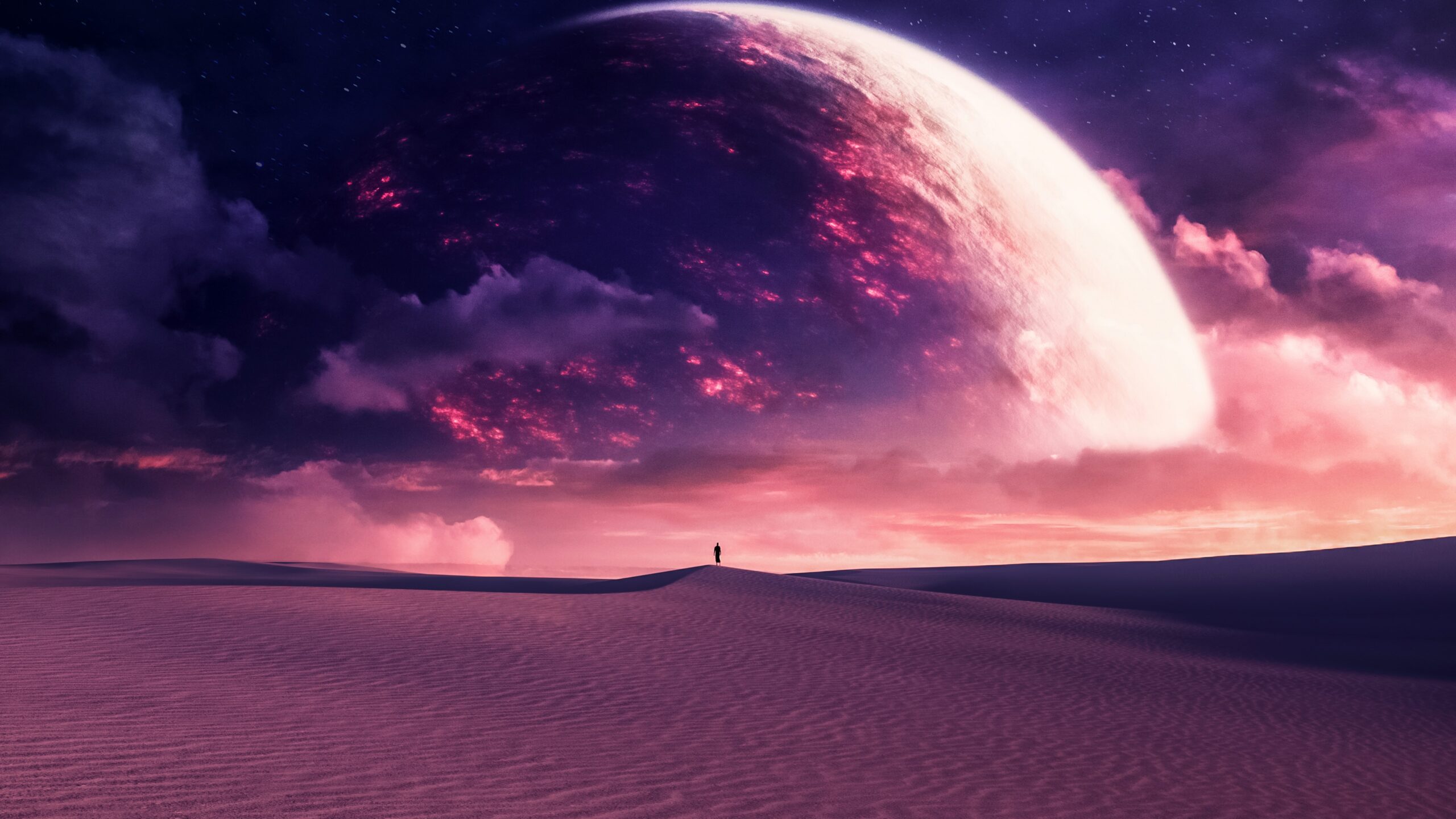 Retro synthwave mountains glow in electric blues and purples beneath a massive pink and orange striped sun against a starry cosmic sky. This neon-soaked digital landscape works beautifully for ultrawide monitors and gaming setups.
