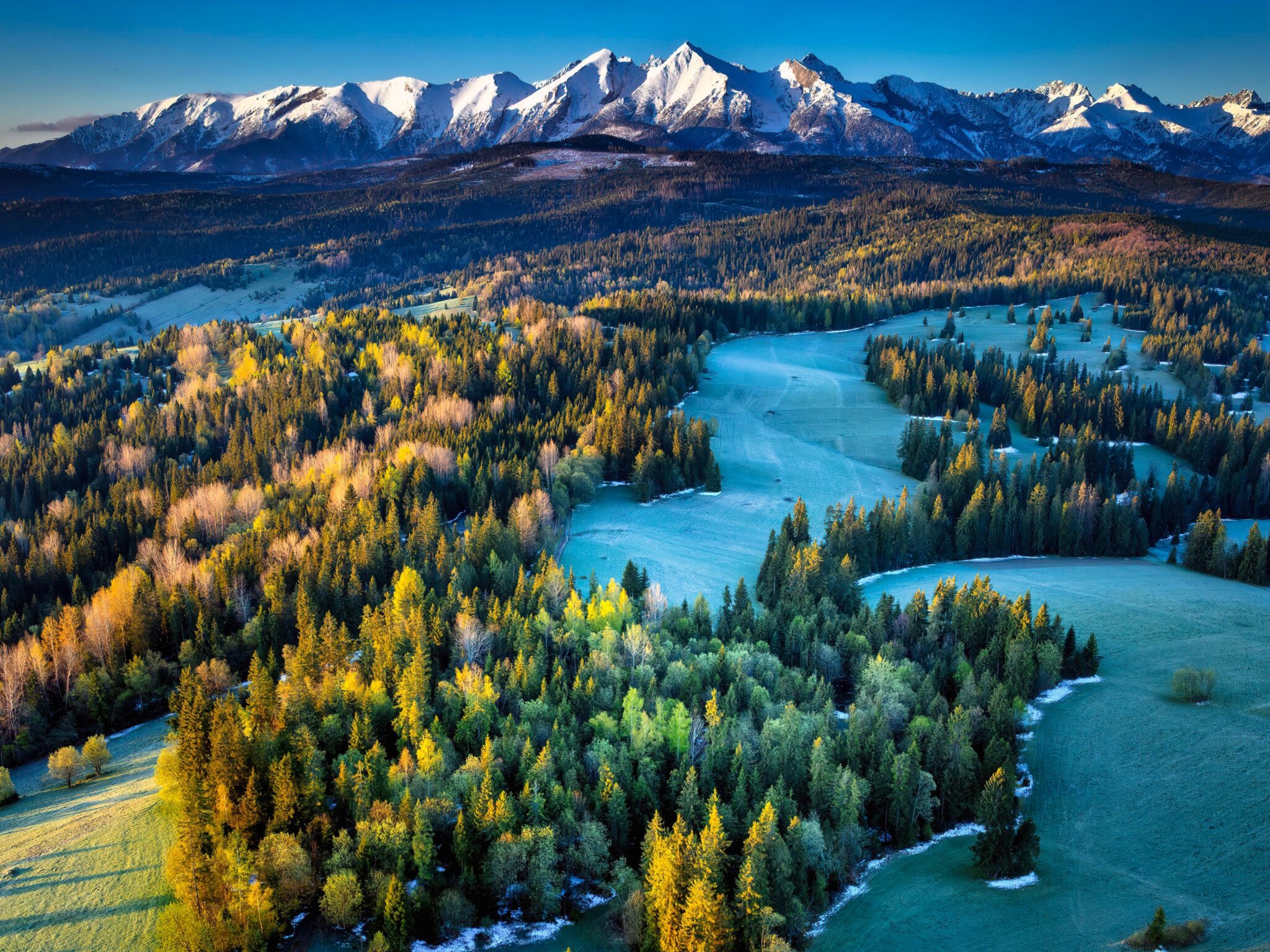 Golden morning light bathes the Tatra mountain forests in warm amber and green hues, with snow-capped peaks rising dramatically in the background. This crisp landscape wallpaper works beautifully for 4K desktop monitors.