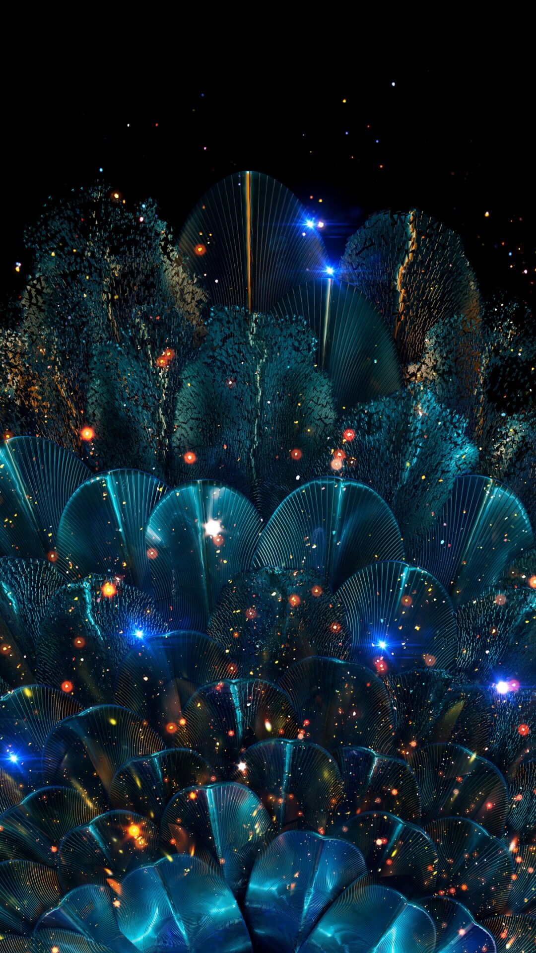 A central, rounded form in teal appears to blossom against a black background, composed of many overlapping shapes. Bright blue and orange p…