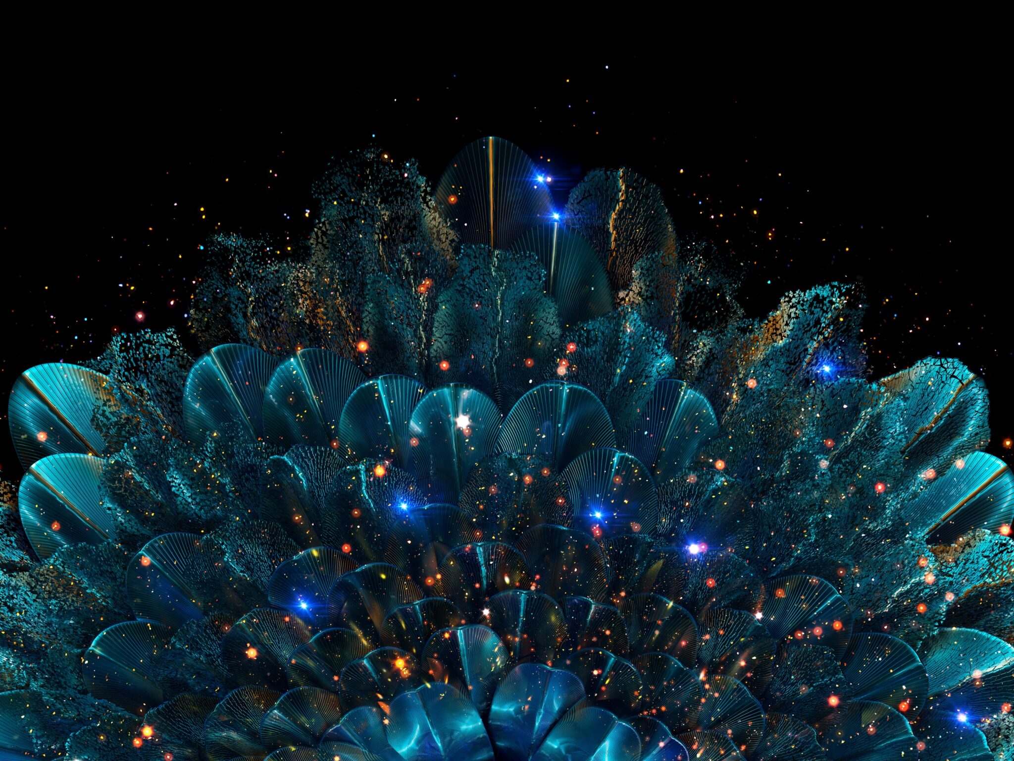 A central, rounded form in teal appears to blossom against a black background, composed of many overlapping shapes. Bright blue and orange particles radiate outwards, adding depth and a sense of energetic dispersal.