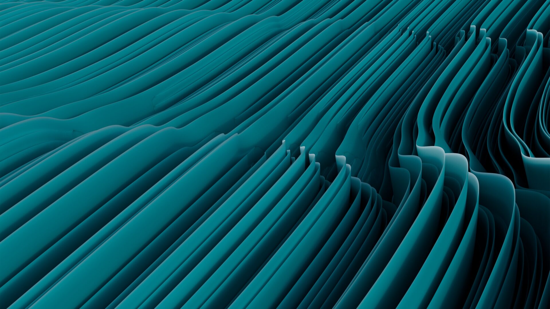 Layered teal and deep cyan waves ripple upward like flowing fabric or a digital landscape, with soft highlights catching the ridges and dark…