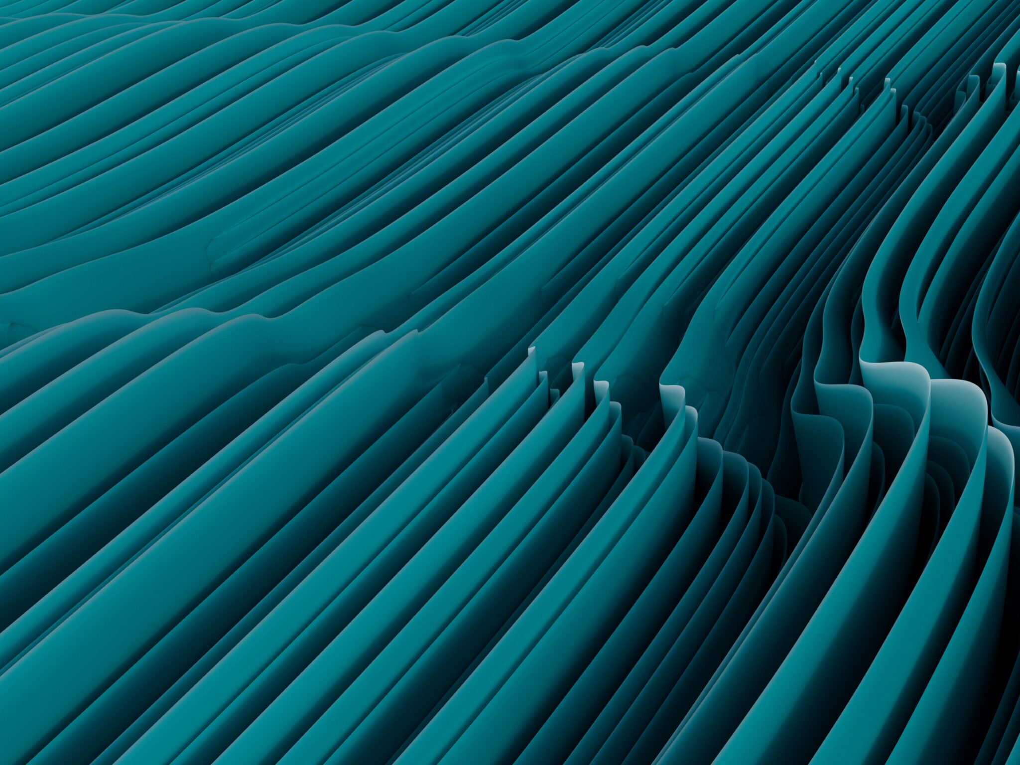 Layered teal and deep cyan waves ripple upward like flowing fabric or a digital landscape, with soft highlights catching the ridges and darker shadows in the valleys. For 4K monitors, this abstract 3840x2160 render adds some cool depth to your desktop.