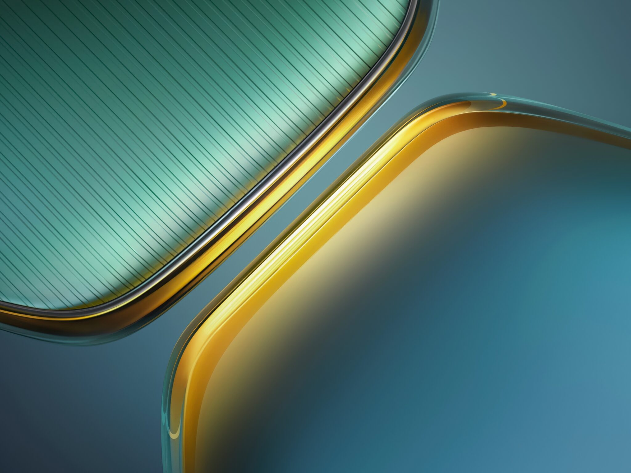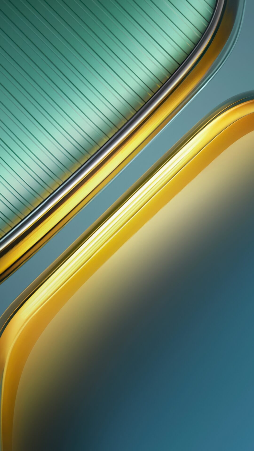 Smooth teal and seafoam green curves with golden amber edges flow across a muted blue-gray background, giving off that sleek glass or polish…