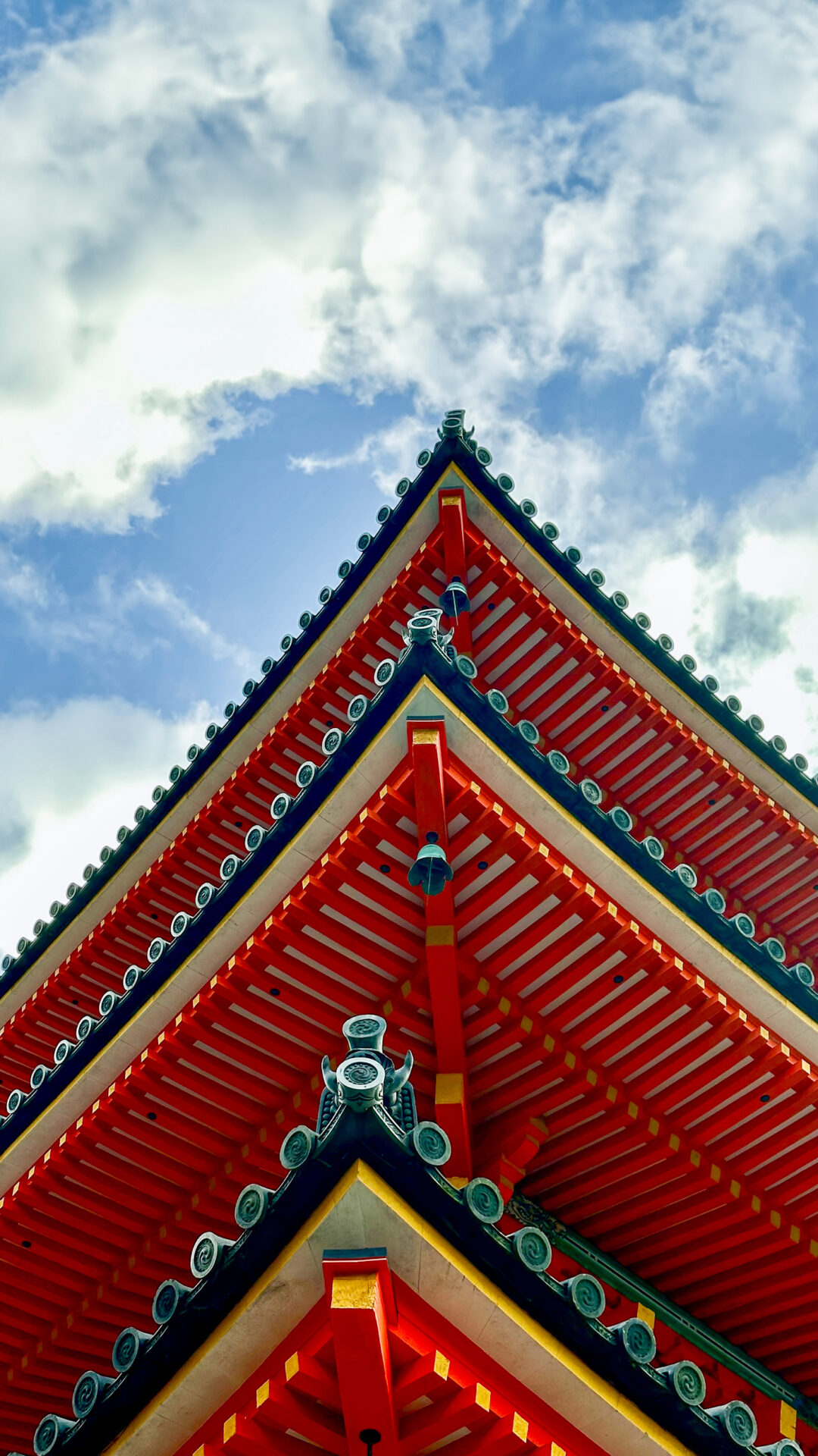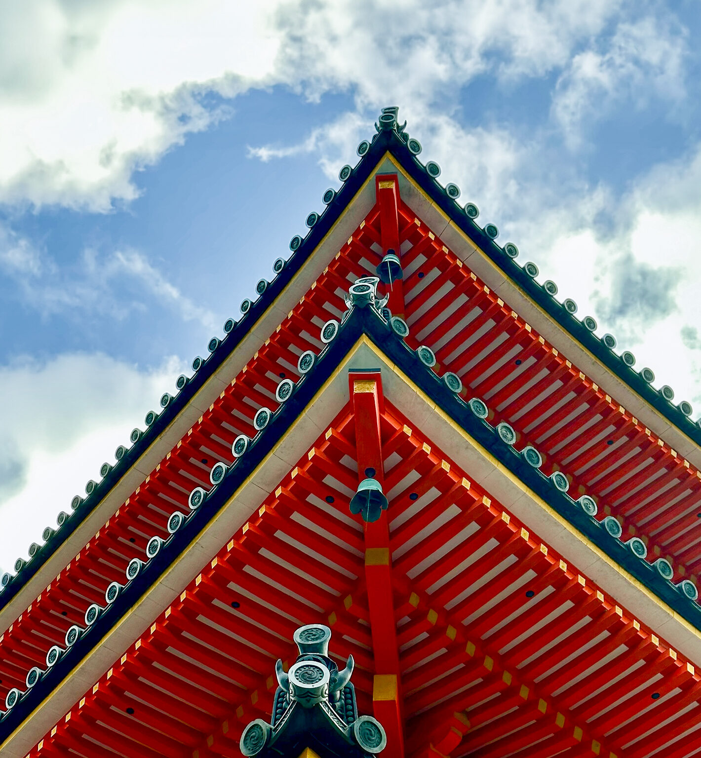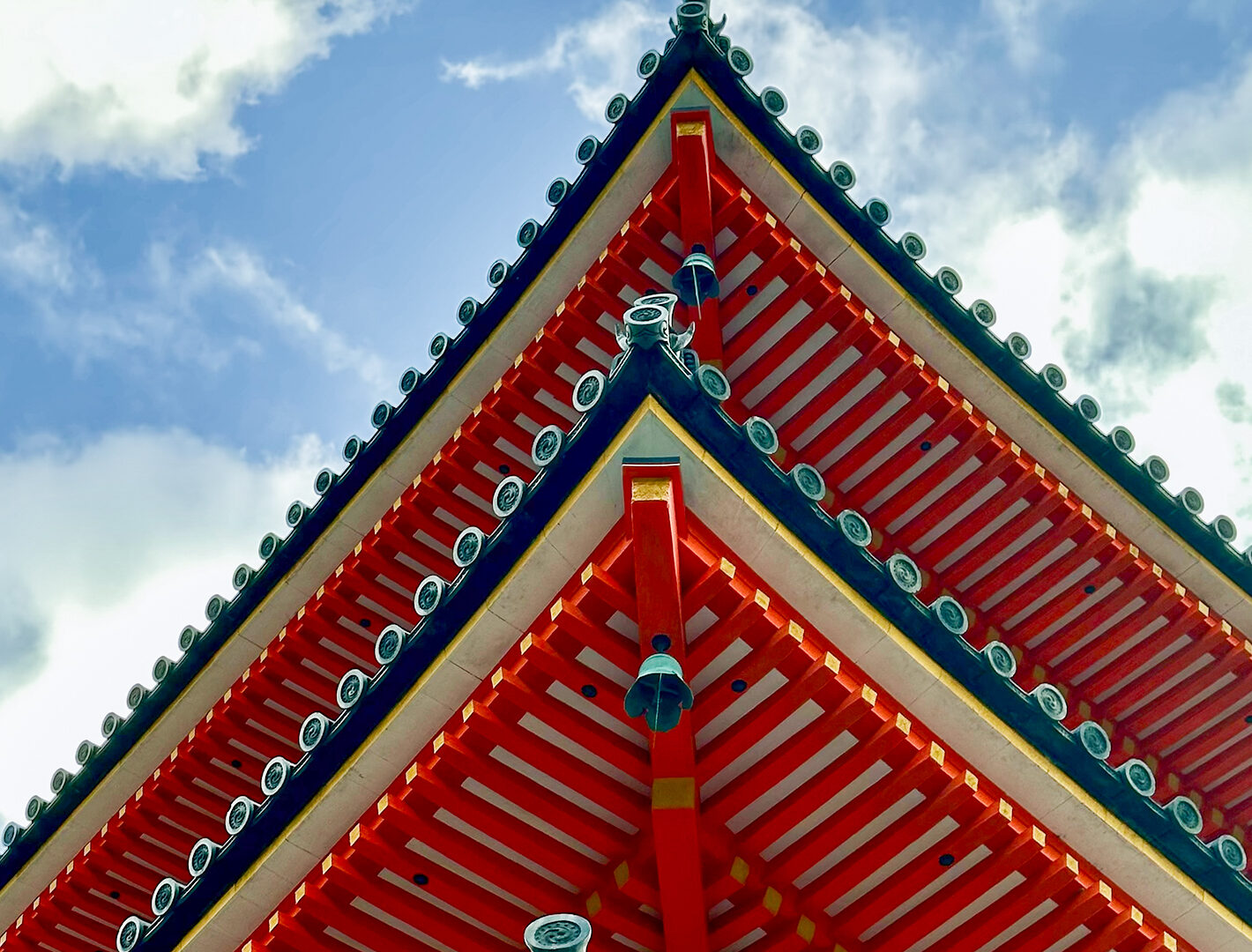 Red temple roofs with dark blue trim angle upwards against a partly cloudy sky. The tight framing emphasizes the repeating horizontal lines …