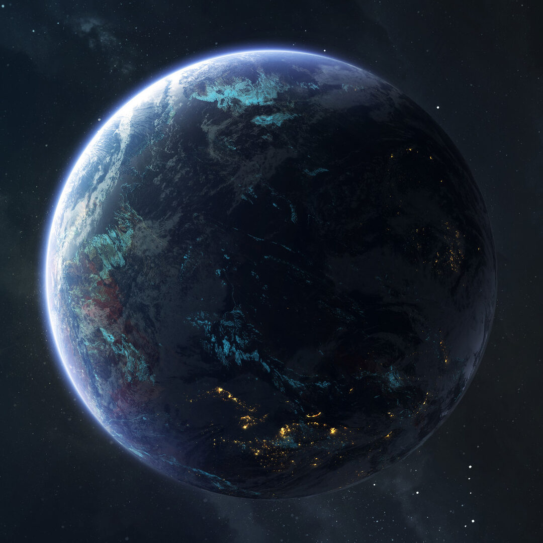 Half the planet glows with scattered yellow city lights on its night side while a thin crescent edge catches the light from an unseen star.