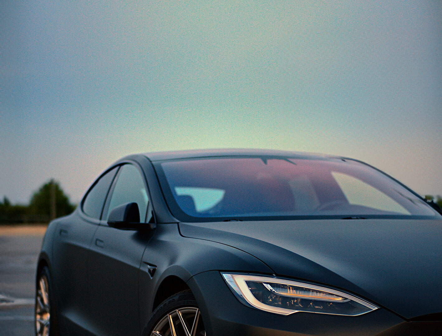 A dark Tesla Model S is parked on asphalt under a gradient sky. The car’s silver multi-spoke wheels and matte finish create strong contrast