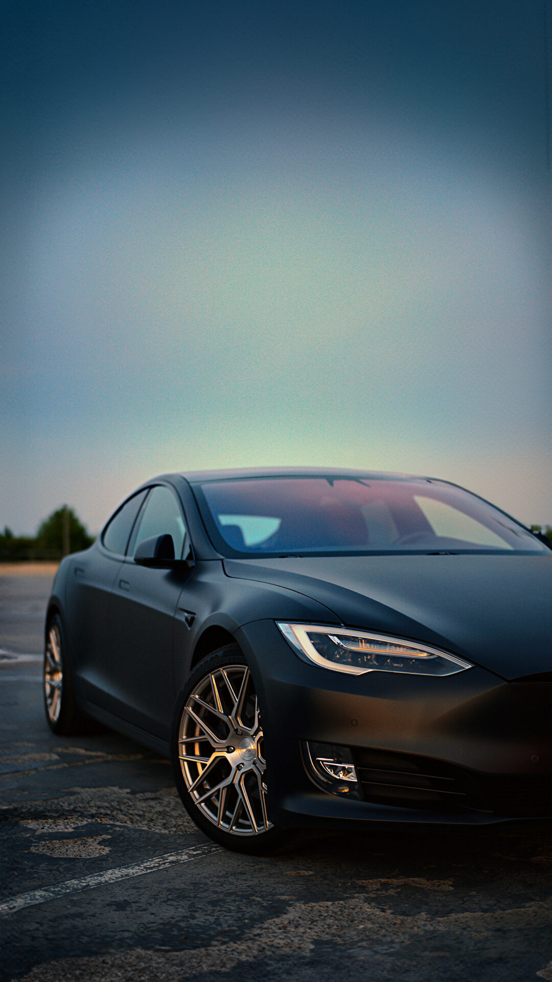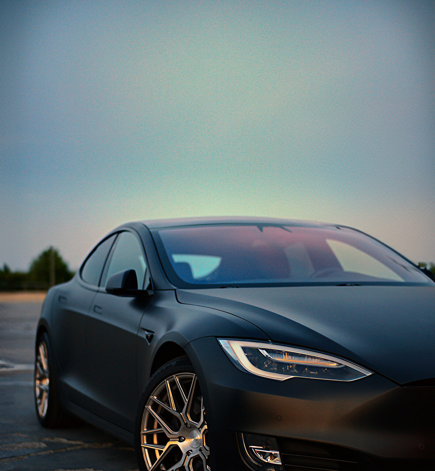 A dark Tesla Model S is parked on asphalt under a gradient sky. The car’s silver multi-spoke wheels and matte finish create strong contrast against the dark body and pavement.
