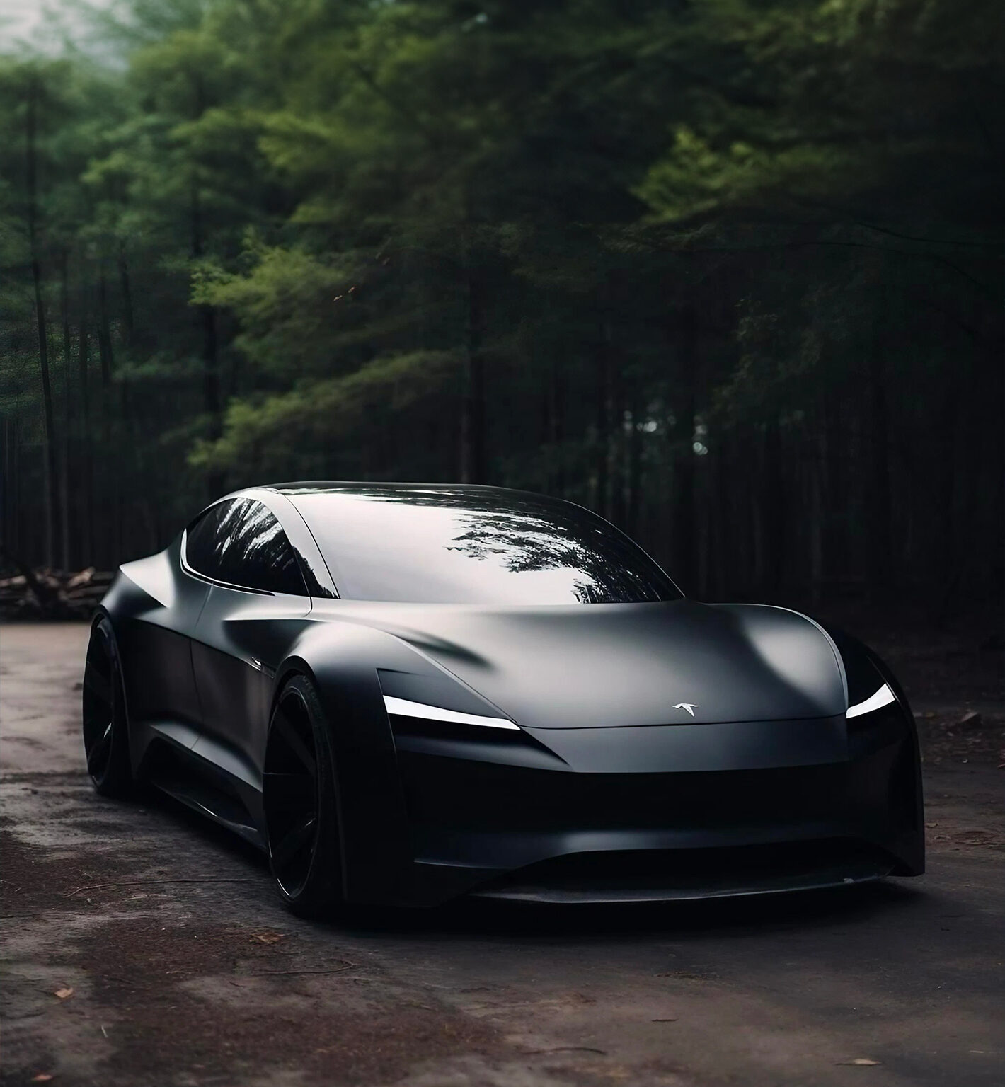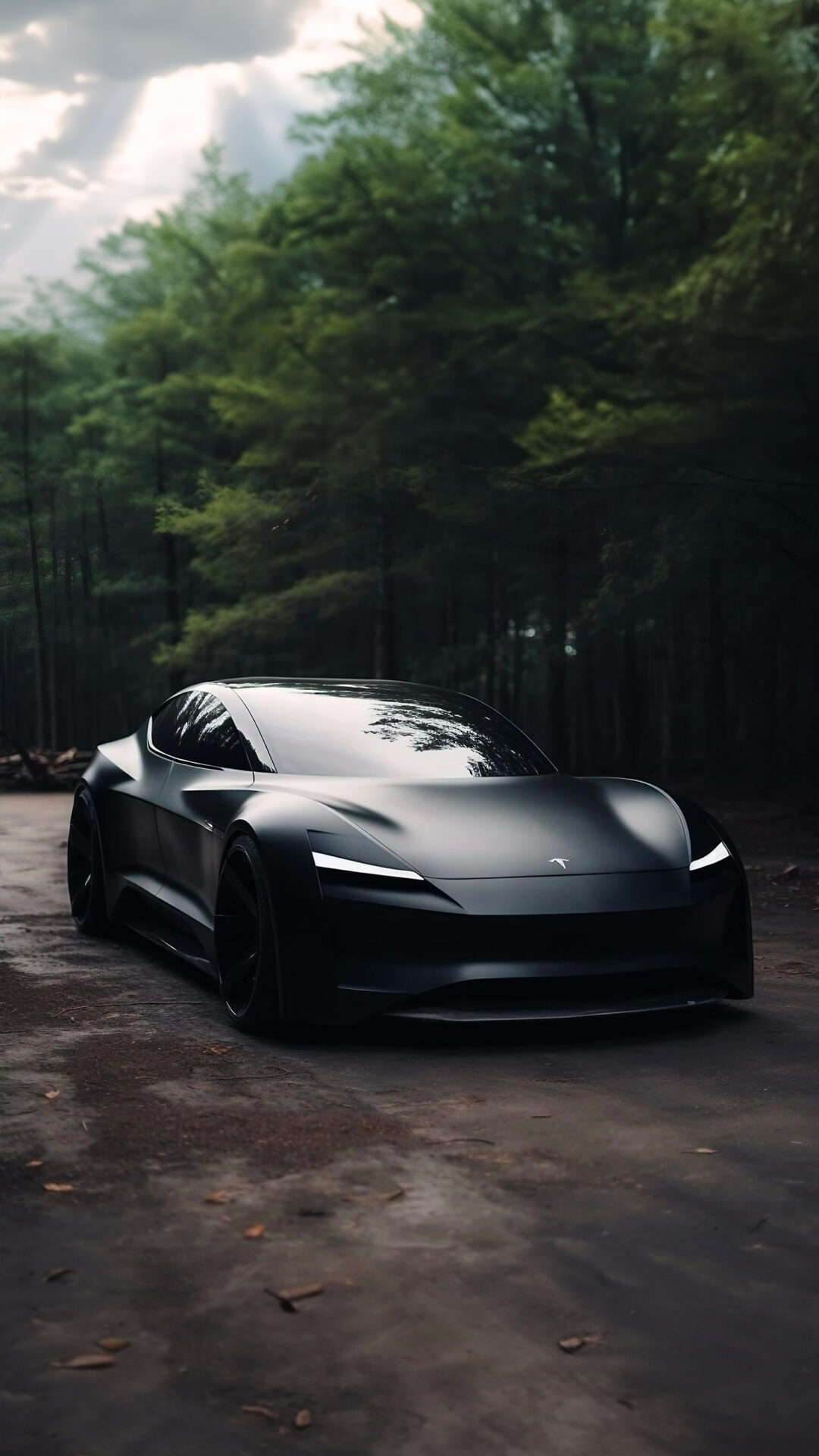A dark Tesla Roadster is parked on a paved surface near dense trees. The overcast sky creates soft, diffused light across the car's matte fi…