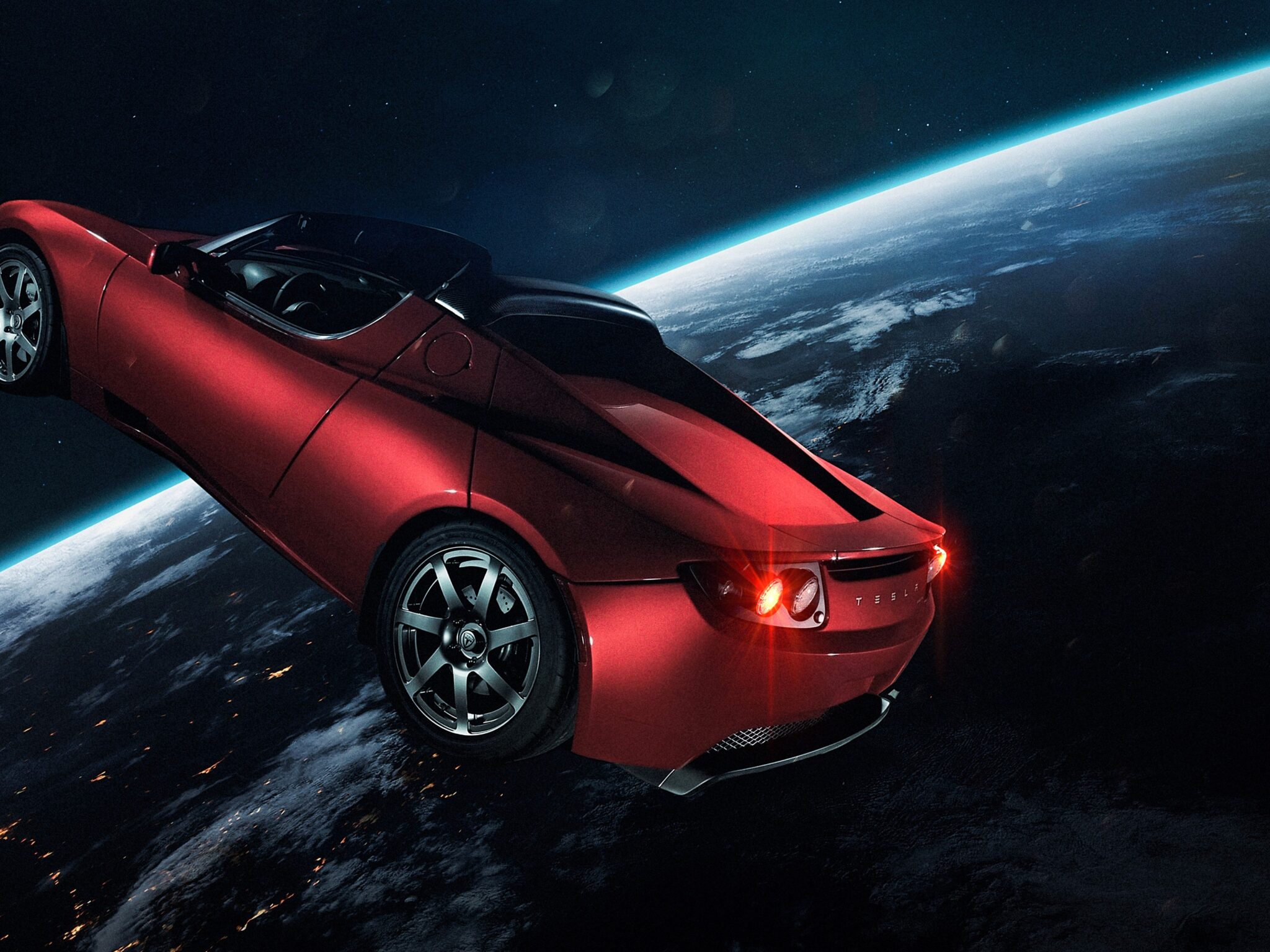 A red Tesla Roadster is positioned in front of Earth’s horizon. Soft, cool blue light reflects across the car’s matte finish, contrasting with the dark space background.