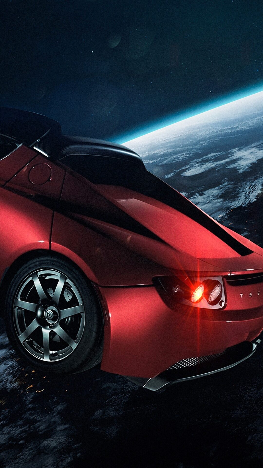 A red Tesla Roadster is positioned in front of Earth’s horizon. Soft, cool blue light reflects across the car’s matte finish, contrasting wi