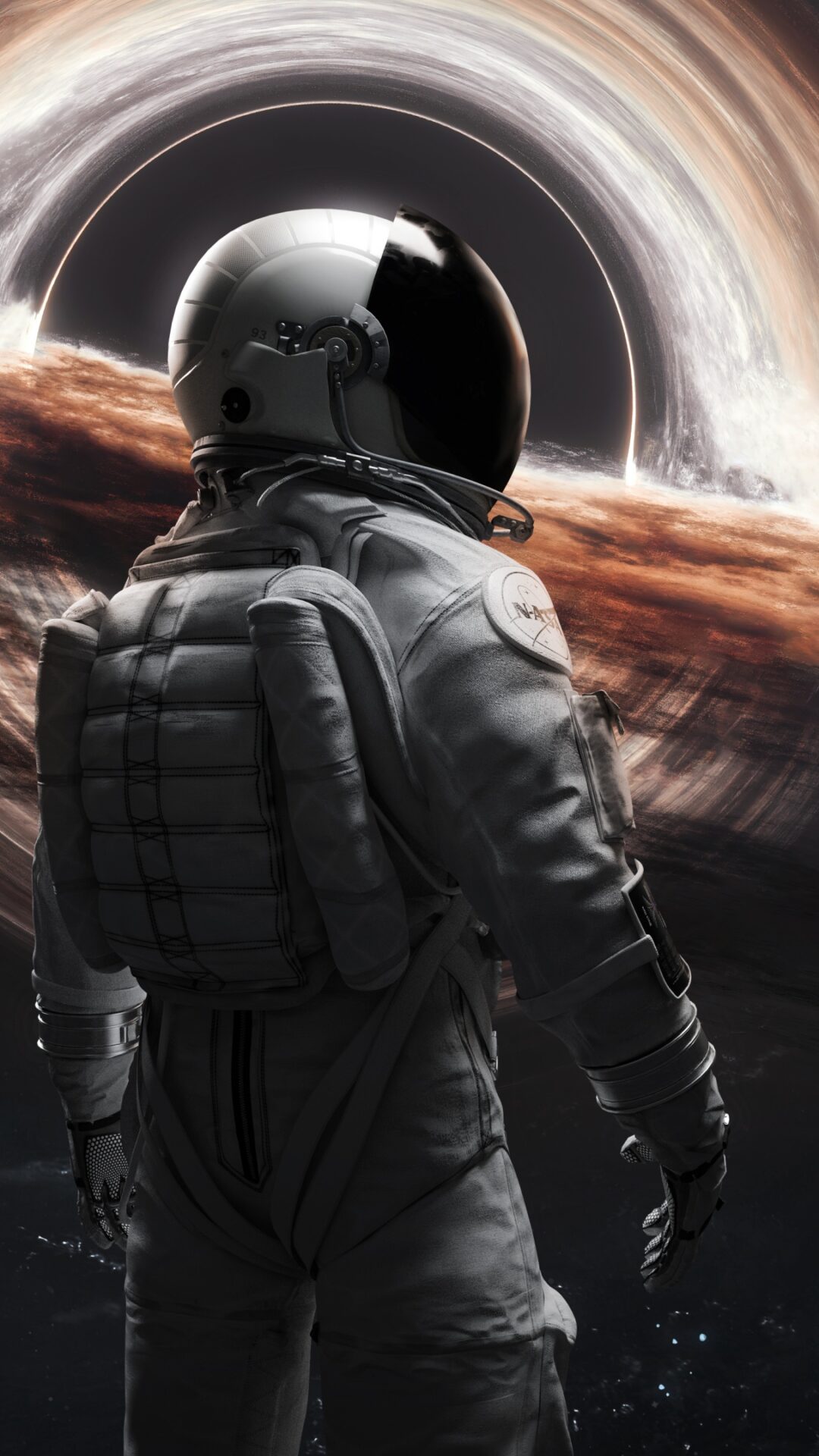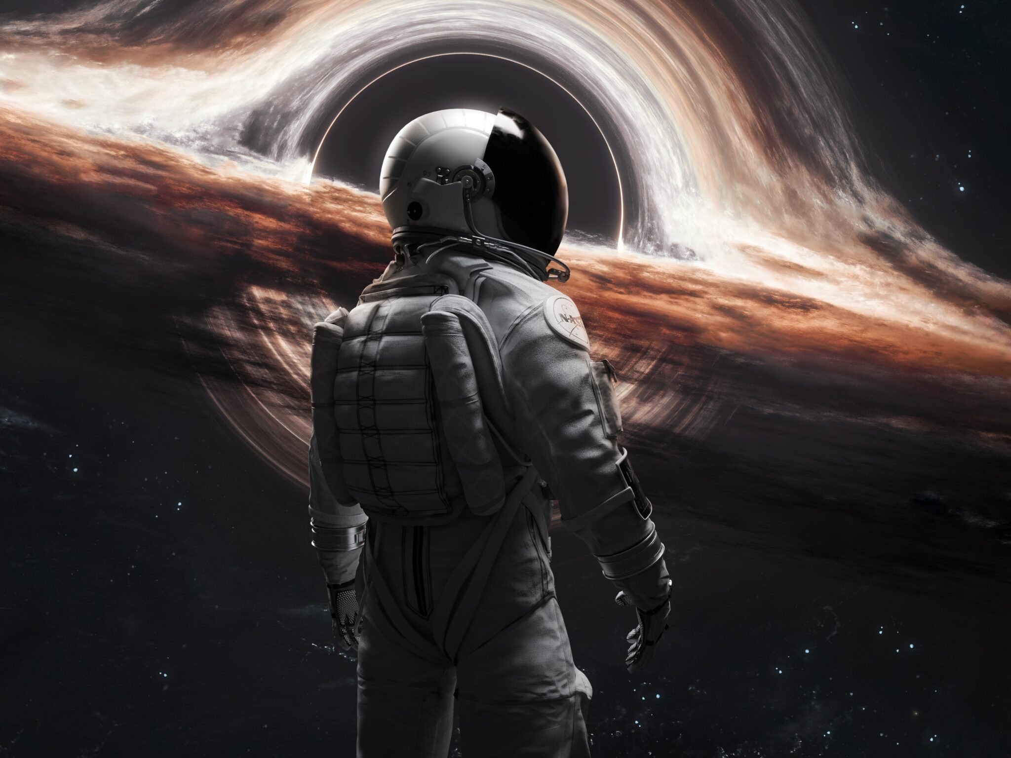 An astronaut in a detailed spacesuit gazes at a massive black hole with swirling orange and white accretion disk against the star-filled dar