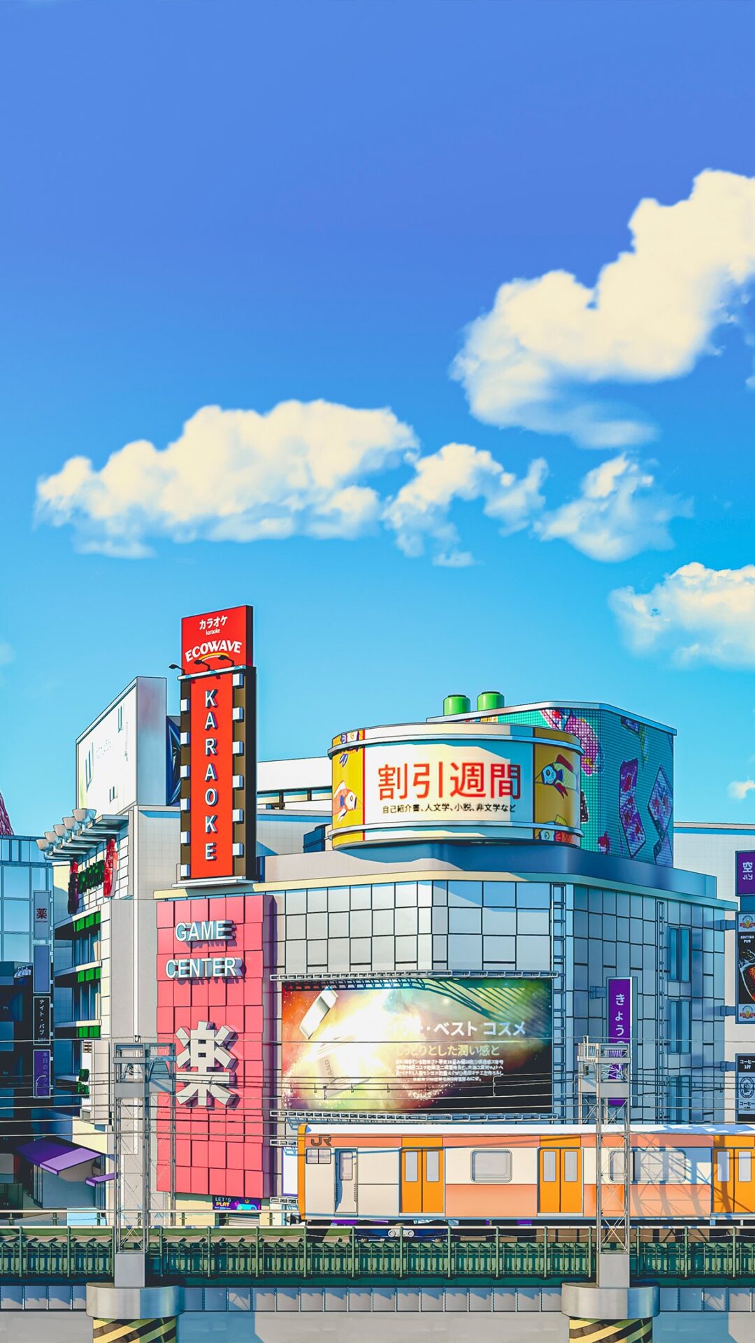 A city view includes modern buildings with large advertisements and a red latticework tower in the distance. The buildings are brightly lit with contrasting colors, and a train runs alongside a concrete barrier in the foreground.