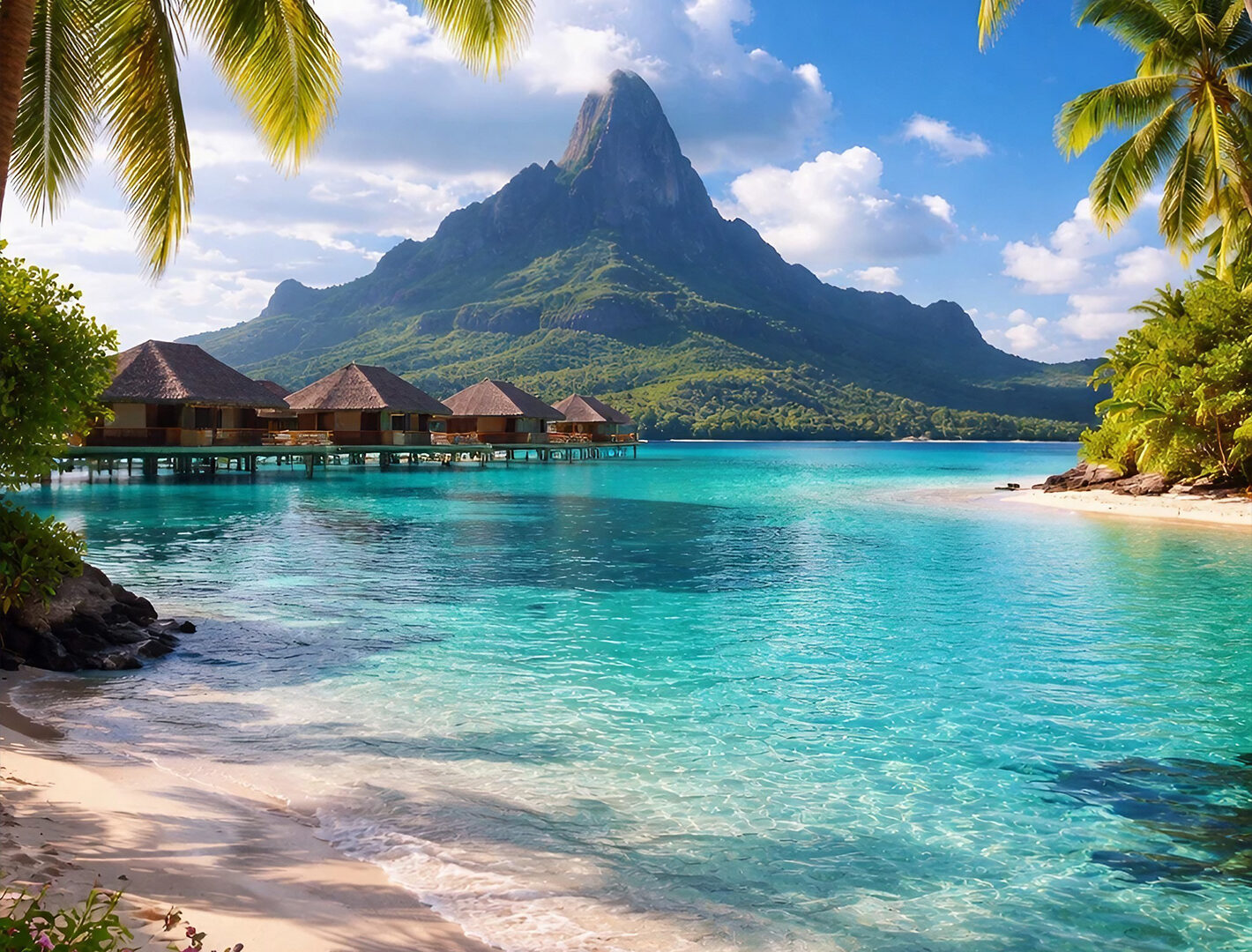 A sandy beach curves along turquoise water toward a distant, steep mountain. Palm trees frame the scene, and scattered pink flowers add a to…